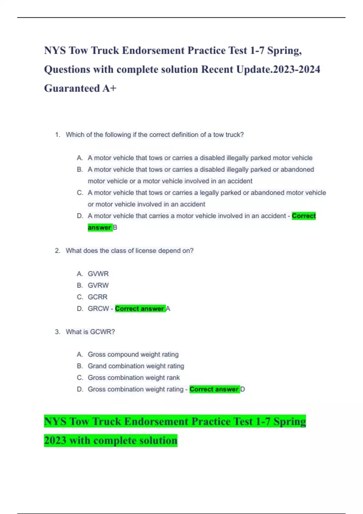 NYS Tow Truck Endorsement Practice Test 1-7 Spring, Questions with complete solution Recent Update. Guaranteed A+.docx