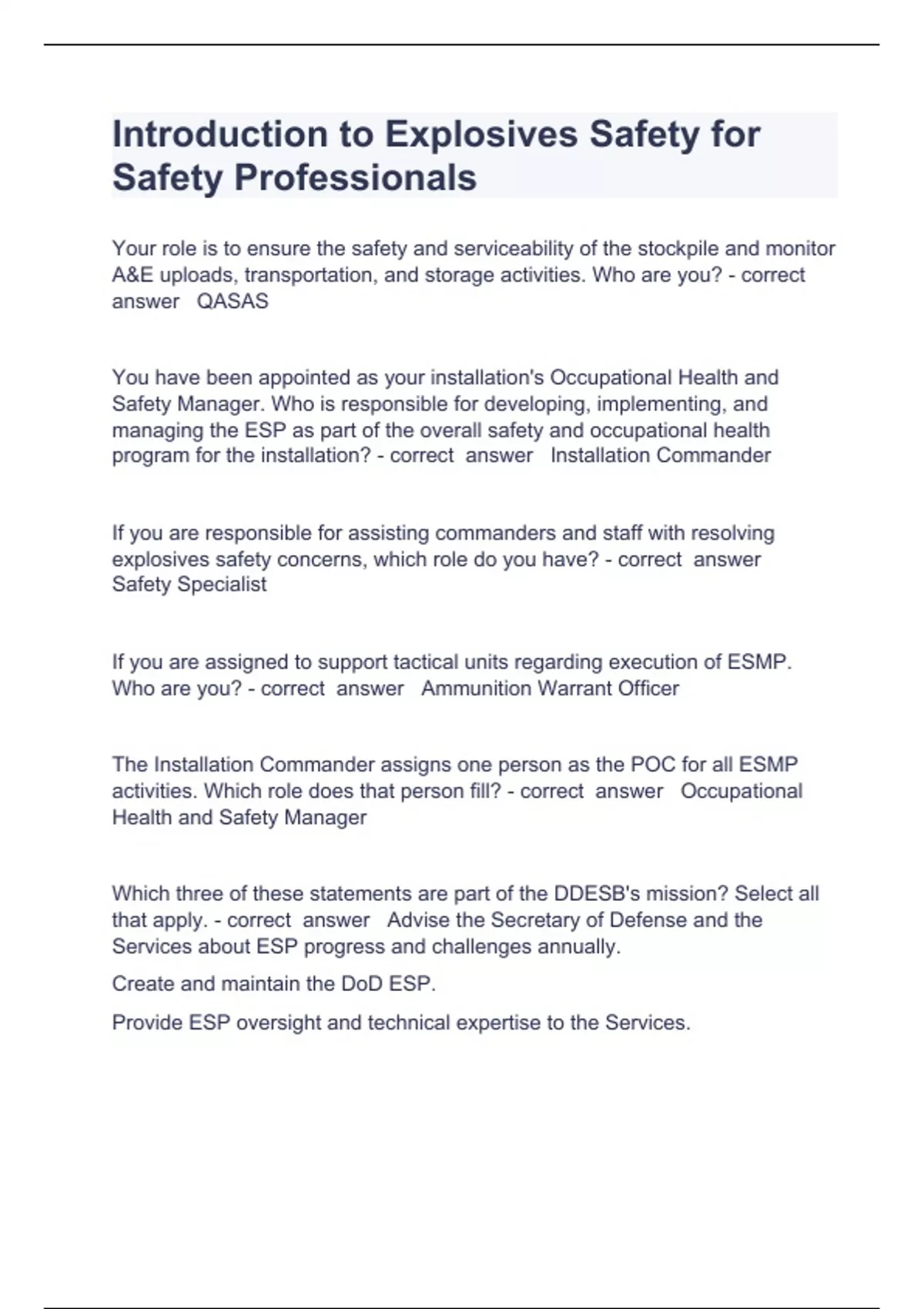 AMMO Introduction to Explosives Safety for Safety Professionals QUESTIONS Your role is to ensure the safety and serviceability of the stockpile and monitor A&E uploads, transportation, and storage activities. Who are you? - correct answer QASAS You have been appointed as your installation's Occupational Health and Safety Manager. Who is responsible for developing, implementing, and managing the ESP as part of the overall safety and occupational health program for the installation? - correct answer Installation Commander If you are responsible for assisting commanders and staff with resolving explosives safety concerns, which role do you have? - correct answer Safety Specialist If you are assigned to support tactical units regarding execution of ESMP. Who are you? - correct answer Ammunition Warrant Officer The Installation Commander assigns one person as the POC for all ESMP activities. Which role does that person fill? - correct answer Occupational Health and Safety Manager Which three of these statements are part of the DDESB's mission? Select all that apply. - correct answer Advise the Secretary of Defense and the Services about ESP progress and challenges annually. Create and maintain the DoD ESP. Provide ESP oversight and technical expertise to the Services. The Cardinal Rule exposes the minimum number of people to the - correct answer minimum amount of explosives for the minimum about of time Ammunition is distributed to units from - correct answer the ASP Ammunition that is old, doesn't work, or is otherwise unusable belongs in which life cycle stage? - correct answer Demilitarization Which two of these could have generated the UXO? Select all that apply. - correct answer Combat Live fire ranges You get a call from the live fire range that someone suspects they've found UXO. Which three of these things do you tell them to do? Select all that apply. - correct answer Contact the proper authorities Don't touch the item Keep others away You are working on new explosives safety guidelines for the Army. What is the key principle you must remember when applying Service publication safety standards? - correct answer Service standards can be more restrictive, but never less restrictive than the DoD standard