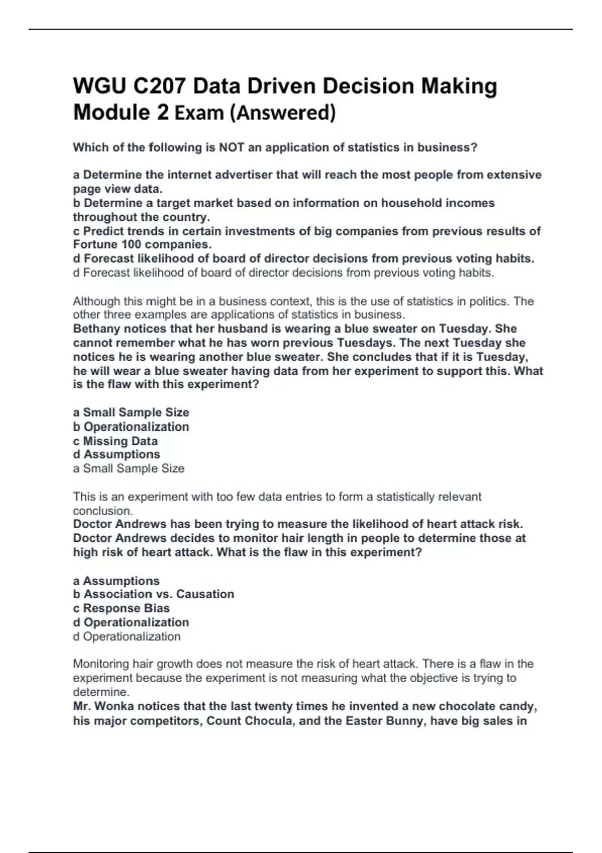 WGU C207 Data Driven Decision Making Module 2 Exam (Answered) Which of the following is NOT an application of statistics in business? a Determine the internet advertiser that will reach the most people from extensive page view data. b Determine a target market based on information on household incomes throughout the country. c Predict trends in certain investments of big companies from previous results of Fortune 100 companies. d Forecast likelihood of board of director decisions from previous voting habits. d Forecast likelihood of board of director decisions from previous voting habits. Although this might be in a business context, this is the use of statistics in politics. The other three examples are applications of statistics in business. Bethany notices that her husband is wearing a blue sweater on Tuesday. She cannot remember what he has worn previous Tuesdays. The next Tuesday she notices he is wearing another blue sweater. She concludes that if it is Tuesday, he will wear a blue sweater having data from her experiment to support this. What is the flaw with this experiment? a Small Sample Size b Operationalization c Missing Data d Assumptions a Small Sample Size This is an experiment with too few data entries to form a statistically relevant conclusion. Doctor Andrews has been trying to measure the likelihood of heart attack risk. Doctor Andrews decides to monitor hair length in people to determine those at high risk of heart attack. What is the flaw in this experiment? a Assumptions b Association vs. Causation c Response Bias d Operationalization d Operationalization Monitoring hair growth does not measure the risk of heart attack. There is a flaw in the experiment because the experiment is not measuring what the objective is trying to determine. Mr. Wonka notices that the last twenty times he invented a new chocolate candy, his major competitors, Count Chocula, and the Easter Bunny, have big sales in late October. Mr. Wonka feels directly responsible for the profit of his competitors. What is the flaw in this experiment? a Small Sample Size b Truly Representative Sample c Association vs. Causation d Blinding c Association vs. Causation Mr. Wonka's inventive ways are probably not the cause of increased chocolate candy sales for his competitors at the end of October like Mr. Wonka has concluded. There is a 90 percent chance that a package will arrive within three days of when it was shipped. Also, there is a 75 percent chance that it will get wet. There is a 70 percent chance that it will get wet and will be delivered within three days. What is the likelihood that at least one of these events occurs? a 0.8 b 0.85 c 0.9 d 0.95 d 0.95 This is a union between P(on time) and P(wet). Therefore, P(on time∪wet) =P(on time)+P(wet)−P(on time∩wet) =0.90+0.75−0.70=0.95=95% There is an 80 percent chance of snow. If it snows there is a 10 percent chance of Todd walking to the store. If it doesn't snow there is a 60 percent chance of Todd walking to the store. What is the likelihood that it will not snow and Todd will walk to the store? a 0.12 b 0.18 c 0.2 d 0.48 a 0.12 The probability of no snow is 20 percent ( P(no snow)=0.20 ), and the probability of Todd walking to the store with no snow is 60 percent ( P(walk|no snow)=0.60 ). Therefore to determine the likelihood of it not snowing and Todd walking to the store, these probabilities are multiplied together. Therefore P(no snow∩walk)=P(no snow)×P(walk|no snow)= 0.20×0.60=0.12=12% Determine the Mode, Median, Mean (in that order) from the following data set. 4, 7, 11, 12, 14, 14, 15, 17, 17, 17, 18, 20, 23, 24, 26, 29, 35, 39, 40 a 17, 17, 20 b 14, 17.5, 17 c 17, 17, 17 d 17, 17, 20.11 d 17, 17, 20.11 The mode is 17 as it shows up 3 times and no other data point shows up as many times. The median is 17 as it is the 10th number out of 19 ordered numbers. The mean is 20.11 as it is the result of the sum of the numbers, 382, divided by 19, the count of numbers. Standard deviation measures a the average of the difference for the data set. b the normal exceptions between the expected data points. c the median of the data set distributed equally. d the dispersion from the average for the data set. d the dispersion from the average for the data set. Elizabeth got a 75 on her performance review. The average was 80, but the standard deviation was 3.5. Determine the z-score for her performance review. a 1.43 b -1.43 c 5 d 3.5 b -1.43 This is because she was 1.43 standard deviations below the average. Z-score is determined by the distance a data point is from the mean divided by the standard deviation. The data point was five below the mean ( therefore -5), and the standard deviation was 3.5. Therefore, the z-score for Elizabeth's performance review was −53.5=−1.43 . Statistical analysis can be used to make __________ about entire populations using samples. a) conclusions b) inferences c) decisions d) references b) inferences What percent of the data of a normal distribution is within two standard deviations of the mean? a) 68.3 b) 75 c) 95.4 d) 99.7 c) 95.4