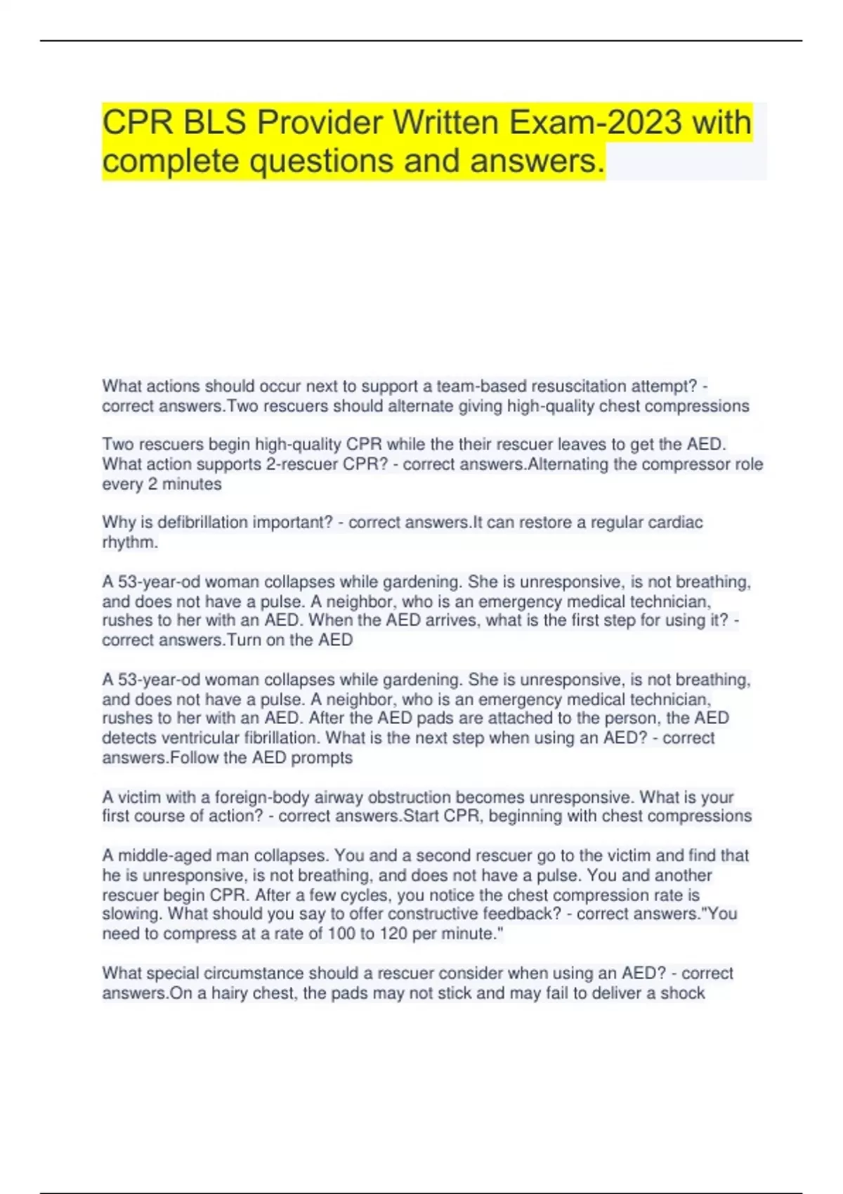CPR BLS Provider Written Exam-2023 with complete questions and answers. What actions should occur next to support a team-based resuscitation attempt? - correct answers.Two rescuers should alternate giving high-quality chest compressions Two rescuers begin high-quality CPR while the their rescuer leaves to get the AED. What action supports 2-rescuer CPR? - correct answers.Alternating the compressor role every 2 minutes Why is defibrillation important? - correct answers.It can restore a regular cardiac rhythm. A 53-year-od woman collapses while gardening. She is unresponsive, is not breathing, and does not have a pulse. A neighbor, who is an emergency medical technician, rushes to her with an AED. When the AED arrives, what is the first step for using it? - correct answers.Turn on the AED A 53-year-od woman collapses while gardening. She is unresponsive, is not breathing, and does not have a pulse. A neighbor, who is an emergency medical technician, rushes to her with an AED. After the AED pads are attached to the person, the AED detects ventricular fibrillation. What is the next step when using an AED? - correct answers.Follow the AED prompts A victim with a foreign-body airway obstruction becomes unresponsive. What is your first course of action? - correct answers.Start CPR, beginning with chest compressions A middle-aged man collapses. You and a second rescuer go to the victim and find that he is unresponsive, is not breathing, and does not have a pulse. You and another rescuer begin CPR. After a few cycles, you notice the chest compression rate is slowing. What should you say to offer constructive feedback? - correct answers."You need to compress at a rate of 100 to 120 per minute." What special circumstance should a rescuer consider when using an AED? - correct answers.On a hairy chest, the pads may not stick and may fail to deliver a shock
