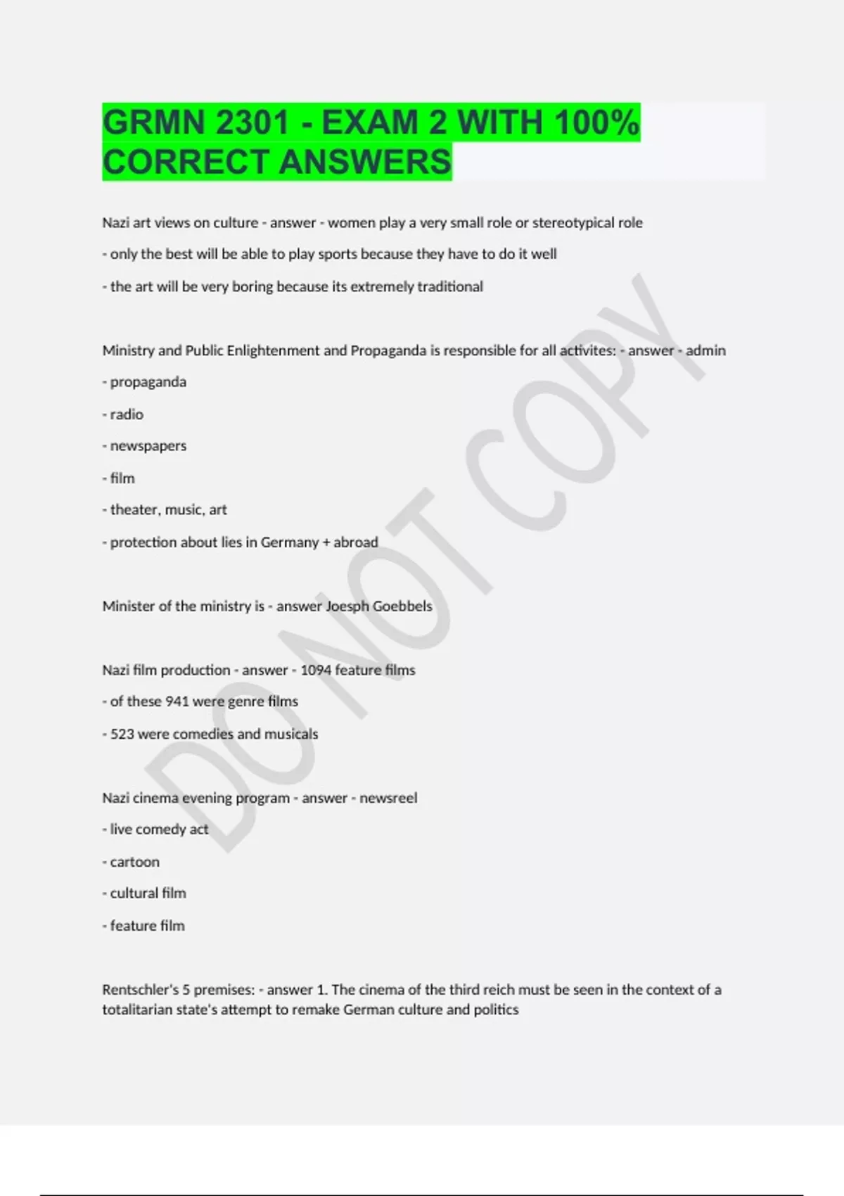 Nazi art views on culture - women play a very small role or stereotypical role - only the best will be able to play sports because they have to do it well - the art will be very boring because its extremely traditional Ministry and Public Enlightenment and Propaganda is responsible for all activites: - admin - propaganda - radio - newspapers - film - theater, music, art - protection about lies in Germany + abroad Brainpower Read More Previous Play Next Rewind 10 seconds Move forward 10 seconds Unmute 0:00 / 0:00 Full screen Minister of the ministry is Joesph Goebbels Nazi film production - 1094 feature films - of these 941 were genre films - 523 were comedies and musicals Nazi cinema evening program - newsreel - live comedy act - cartoon - cultural film - feature film Rentschler's 5 premises: 1. The cinema of the third reich must be seen in the context of a totalitarian state's attempt to remake German culture and politics 2. Nazi films were meant to entertain, "to move the hearts and minds of masses while seeming to have little to do with politics" 3. Orchestra principle: cinema plays a part in the overall program of creating a new culture 4. Nazi culture was a popular culture, not just 'official art' 5. Nazi films aimed to be aesthically pleasing and drew on traditional models of filmmaking, including American cinema conventions Triumph of the Will - filmed at the 1934 Nuremburg Party congress - director = Leni Rienfenstahl () - length 120 min - made w a team of 120 analysis of Triumph of the Will - the men are from all different places - working for the good of the race - showing their hands showed physical labor - not a lot of indiviudilization - ritualistic aspect La Habanara - Zarah Leander = swedish actress - there are continoutites from Hollywood movie stars to Nazi moviestars - part of an evening movie program at the cinema - part of an overall transformation of German society Ernst Jünger () - Storm of Steel (1920) - 1923 = leaves military - 1920s = studies zoology, philosophy; active writer for nationalist + right wing press "The Worker" by Ernst Jünger (1932) - proposes new race/species of the "worker" - worker is not an individual - worker = a new human being for a new society Bourgeois Society's view of itself - it values = - predictability - convience - individuals - comfort - sees pain in boredom + physiological problems Exhibition of "Great German Art Exhibition" - everything was very classical + traditional - building = Haus der Deutschen Kunst Hitler's speech at the opening of the exhibition - Very against art that is international, modern, changes in history - praises art that is German and eternal Hitler's critique of "degenerate art" (modern art) - either criminals or sick degenerate art exhibit - July-November 1937 - Munich, Germany - 650+ paintings, prints, sculptures, books - by 120 artists (mostly German) - taken from German museums - 20,000 visitors a day, free - moved to different cities too - "chamber of horror" was entertaining + political - art wasn't presented in an attractive way - goal was to reduce all the work to the same basic level, to prevent any single work from developing an individual presence - cramped hanging, bad lighting - distraction from the actual artwork on display works were declared degenerate for - insulting German feeling - destroying or confusing natural form - lacking adequate manual and artistic skill what was shown in the exhibit - modern art - abstract, cubist, fauve, expressionist, etc. - regardless of the artist's political views Info about the Holocaust 1. Holocaust + Nazism 2. Intentionalist v. Functionalist approach 3. Holocaust timeline Importance of Holocaust for Nazism - Holocaust was central for Nazism - because antisemitism was central to Nazism 2 approaches to Holocaust - intentionalist - functionalist interpretation Intentionalist interprets "the actions of the Nazi regime as the unfolding of the ideology and expressed intentions of its leadership (and of Hitler in particular)" Functionalist interpretation interprets the actions of the Nazi regime by "focusing on the dynamic of decision-making processes and the institutional pressures inherent in the Nazi system of government" Holocaust timeline : - gradual isolation of German Jews through economic measures, violence - firing of Jews, special taxes, export restrictions, banned from many public spaces - government encouraged Jewish emigration and made it difficult - exemptions - mostly for veterans-gradually phased out - tensions w/ conservatives - international tensions - by 1938, conservative military + political officials dismissed - = almost half of Germany's Jews emigrate (300,000 people)