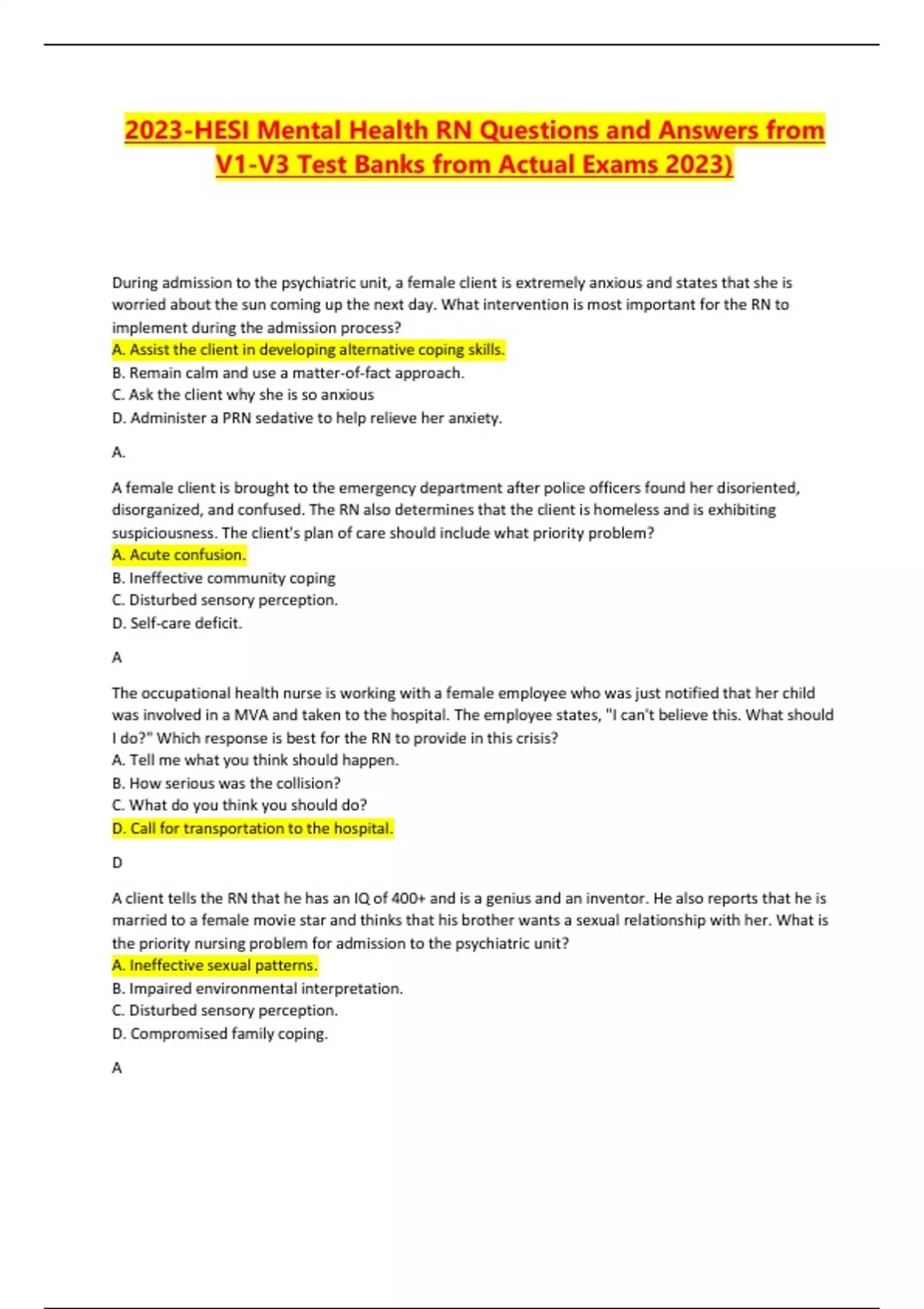 2023-HESI Mental Health RN Questions and Answers from V1-V3 Test Banks from Actual Exams 2023) During admission to the psychiatric unit, a female client is extremely anxious and states that she is worried about the sun coming up the next day. What intervention is most important for the RN to implement during the admission process? A. Assist the client in developing alternative coping skills. B. Remain calm and use a matter-of-fact approach. C. Ask the client why she is so anxious D. Administer a PRN sedative to help relieve her anxiety. A. A female client is brought to the emergency department after police officers found her disoriented, disorganized, and confused. The RN also determines that the client is homeless and is exhibiting suspiciousness. The client's plan of care should include what priority problem? A. Acute confusion. B. Ineffective community coping C. Disturbed sensory perception. D. Self-care deficit. A The occupational health nurse is working with a female employee who was just notified that her child was involved in a MVA and taken to the hospital. The employee states, "I can't believe this. What should I do?" Which response is best for the RN to provide in this crisis? A. Tell me what you think should happen. B. How serious was the collision? C. What do you think you should do? D. Call for transportation to the hospital.
