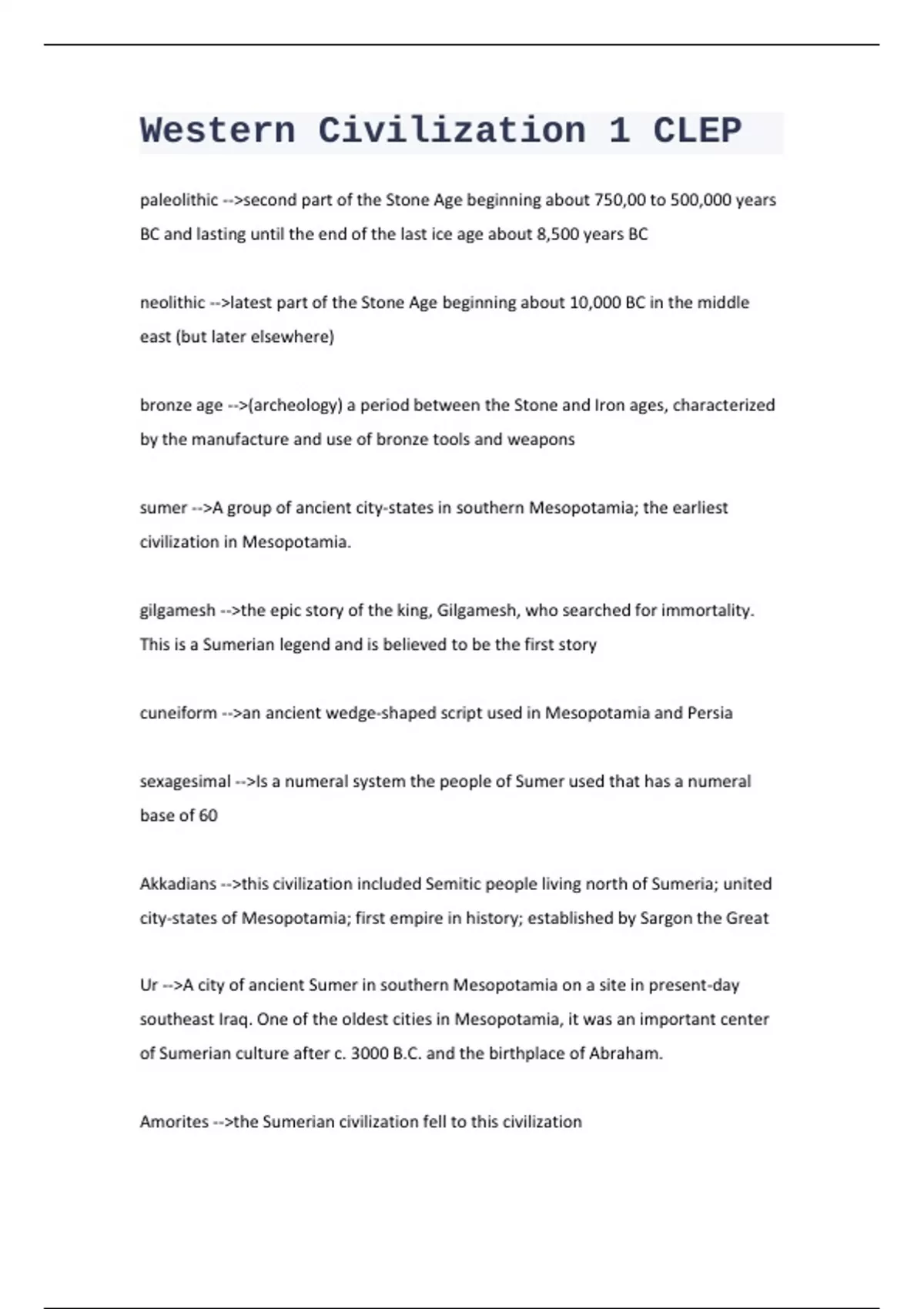 paleolithic -->second part of the Stone Age beginning about 750,00 to 500,000 years BC and lasting until the end of the last ice age about 8,500 years BC neolithic -->latest part of the Stone Age beginning about 10,000 BC in the middle east (but later elsewhere) bronze age -->(archeology) a period between the Stone and Iron ages, characterized by the manufacture and use of bronze tools and weapons sumer -->A group of ancient city-states in southern Mesopotamia; the earliest civilization in Mesopotamia. gilgamesh -->the epic story of the king, Gilgamesh, who searched for immortality. This is a Sumerian legend and is believed to be the first story cuneiform -->an ancient wedge-shaped script used in Mesopotamia and Persia sexagesimal -->Is a numeral system the people of Sumer used that has a numeral base of 60 Akkadians -->this civilization included Semitic people living north of Sumeria; united city-states of Mesopotamia; first empire in history; established by Sargon the Great Ur -->A city of ancient Sumer in southern Mesopotamia on a site in present-day southeast Iraq. One of the oldest cities in Mesopotamia, it was an important center of Sumerian culture after c. 3000 B.C. and the birthplace of Abraham. Amorites -->the Sumerian civilization fell to this civilization Hittites -->Groups like the ______ in Anatolia gained control over iron weapons and were able to subjugate their less powerful neighbors. Kassites -->a member of an ancient people who ruled Babylonia between 1520 and 1170 BC Egyptians -->we are the people who built great pyramids and were ruled by monarchs called pharaohs Giza -->An ancient city capital of Upper Egypt; site of the Great Pyramids Hyksos -->The people who invaded Egypt thus beginning the second Intermediate period during which the ______ ( a word meaning "foreigner) ruled as pharaohs in Lower Egypt and exacted tribute from the royal families in Thebes. Ra -->ancient hawk-headed Egyptian sun god Akhenaton -->early ruler of Egypt who rejected the old gods and replaced them with sun worship (died in 1358 BC) Hieroglyphics -->an ancient Egyptian writing system in which pictures were used to represent ideas and sounds Mycenaeans -->first Greek-speaking people; invaded Minoans; dominated Greek world 1400 B.C. to 1200 B.C.; sea traders; lived in separate city-states; invovled in Trojan War against Troy Iliad -->a Greek epic poem (attributed to Homer) describing the siege of Troy Phoenicians -->Sailing and trading people who had many colonies on the Mediterranean coast