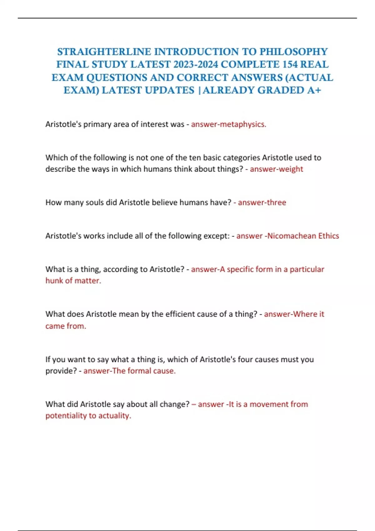 STRAIGHTERLINE INTRODUCTION TO PHILOSOPHY FINAL STUDY LATEST COMPLETE 154 REAL EXAM QUESTIONS AND CORRECT ANSWERS (ACTUAL EXAM) LATEST UPDATES |ALREADY GRADED A+