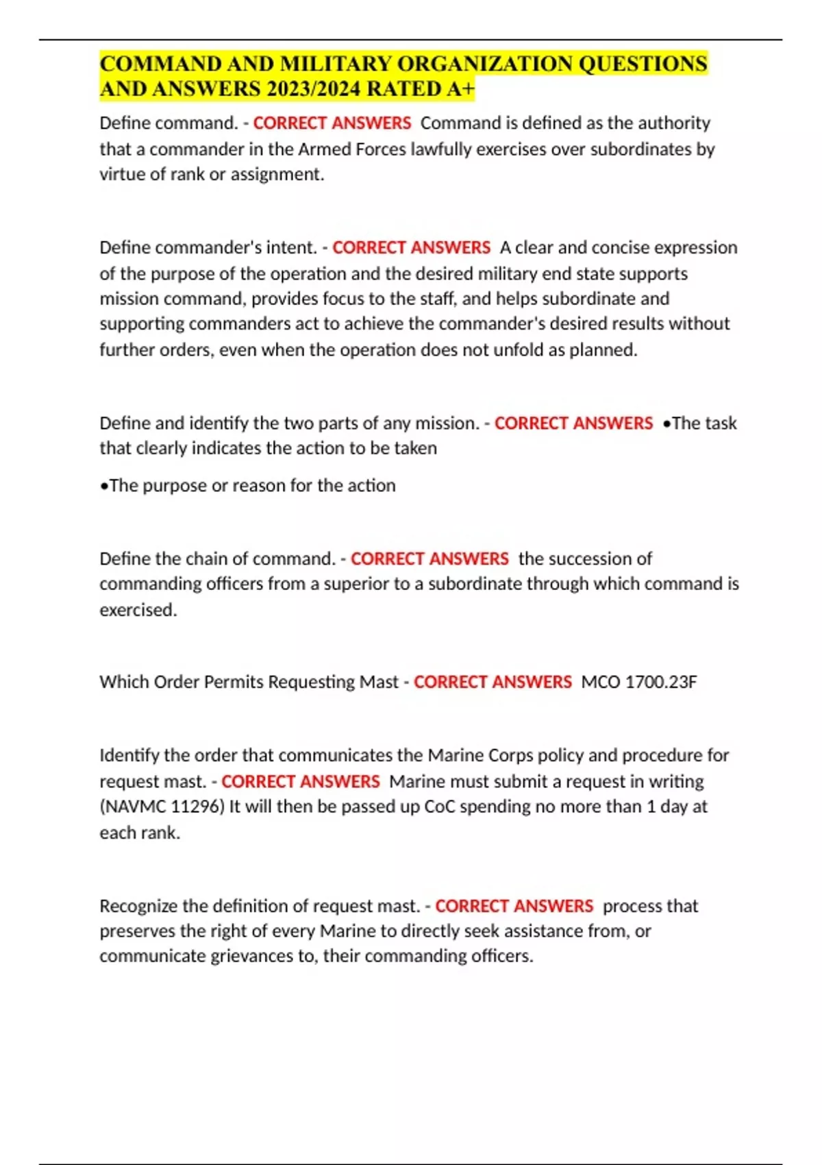 COMMAND AND MILITARY ORGANIZATION QUESTIONS AND ANSWERS 2023/2024 RATED A+