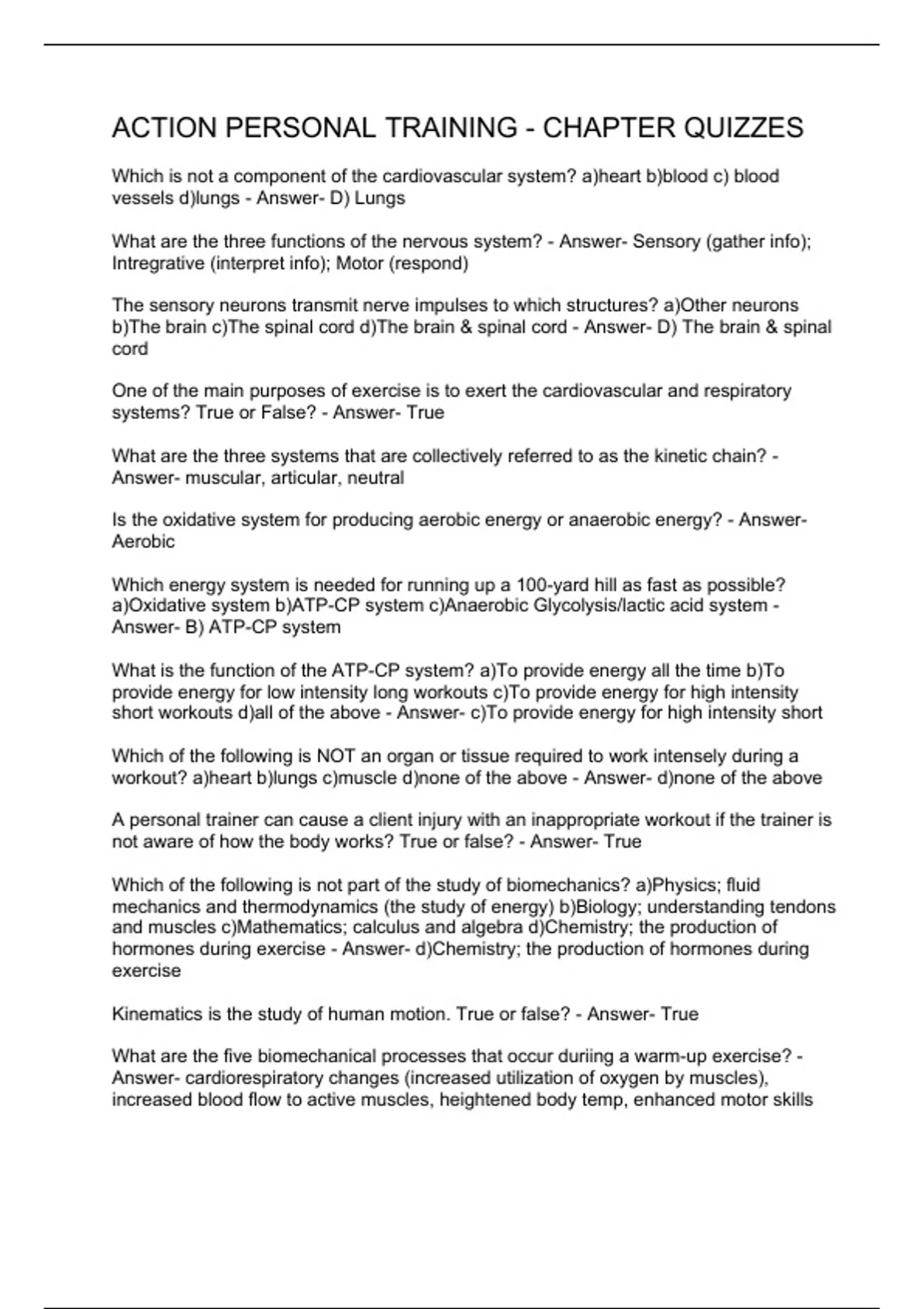 Which is not a component of the cardiovascular system? a)heart b)blood c) blood vessels d)lungs - Answer- D) Lungs What are the three functions of the nervous system? - Answer- Sensory (gather info); Intregrative (interpret info); Motor (respond) The sensory neurons transmit nerve impulses to which structures? a)Other neurons b)The brain c)The spinal cord d)The brain & spinal cord - Answer- D) The brain & spinal cord One of the main purposes of exercise is to exert the cardiovascular and respiratory systems? True or False? - Answer- True What are the three systems that are collectively referred to as the kinetic chain? - Answer- muscular, articular, neutral Is the oxidative system for producing aerobic energy or anaerobic energy? - Answer- Aerobic Which energy system is needed for running up a 100-yard hill as fast as possible? a)Oxidative system b)ATP-CP system c)Anaerobic Glycolysis/lactic acid system - Answer- B) ATP-CP system What is the function of the ATP-CP system? a)To provide energy all the time b)To provide energy for low intensity long workouts c)To provide energy for high intensity short workouts d)all of the above - Answer- c)To provide energy for high intensity short Which of the following is NOT an organ or tissue required to work intensely during a workout? a)heart b)lungs c)muscle d)none of the above - Answer- d)none of the above A personal trainer can cause a client injury with an inappropriate workout if the trainer is not aware of how the body works? True or false? - Answer- True Which of the following is not part of the study of biomechanics? a)Physics; fluid mechanics and thermodynamics (the study of energy) b)Biology; understanding tendons and muscles c)Mathematics; calculus and algebra d)Chemistry; the production of hormones during exercise - Answer- d)Chemistry; the production of hormones during exercise Kinematics is the study of human motion. True or false? - Answer- True What are the five biomechanical processes that occur duriing a warm-up exercise? - Answer- cardiorespiratory changes (increased utilization of oxygen by muscles), incr