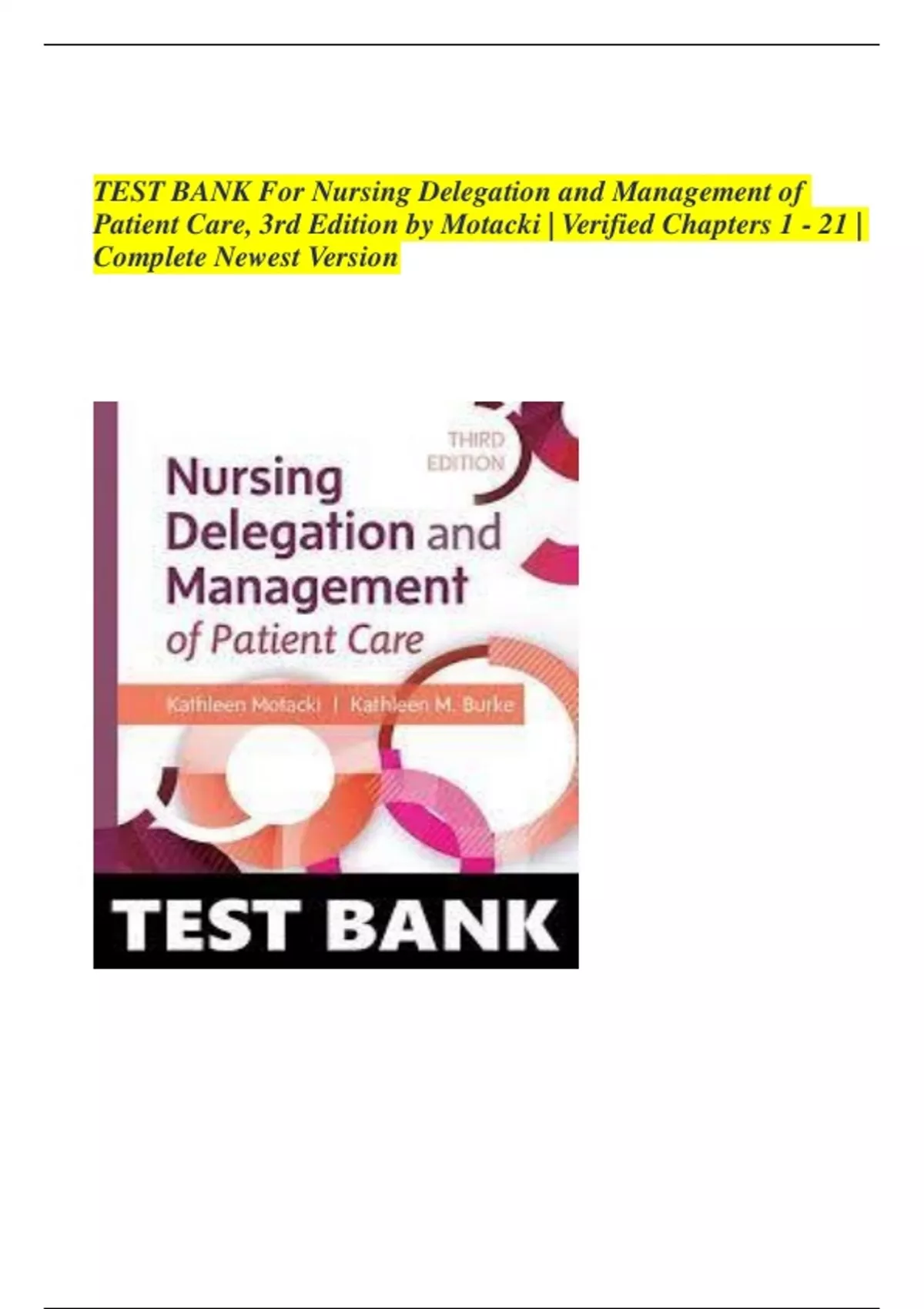 TEST BANK For Nursing Delegation and Management of Patient Care, 3rd Edition by Motacki | Verified Chapters 1 - 21 | Complete Newest Version