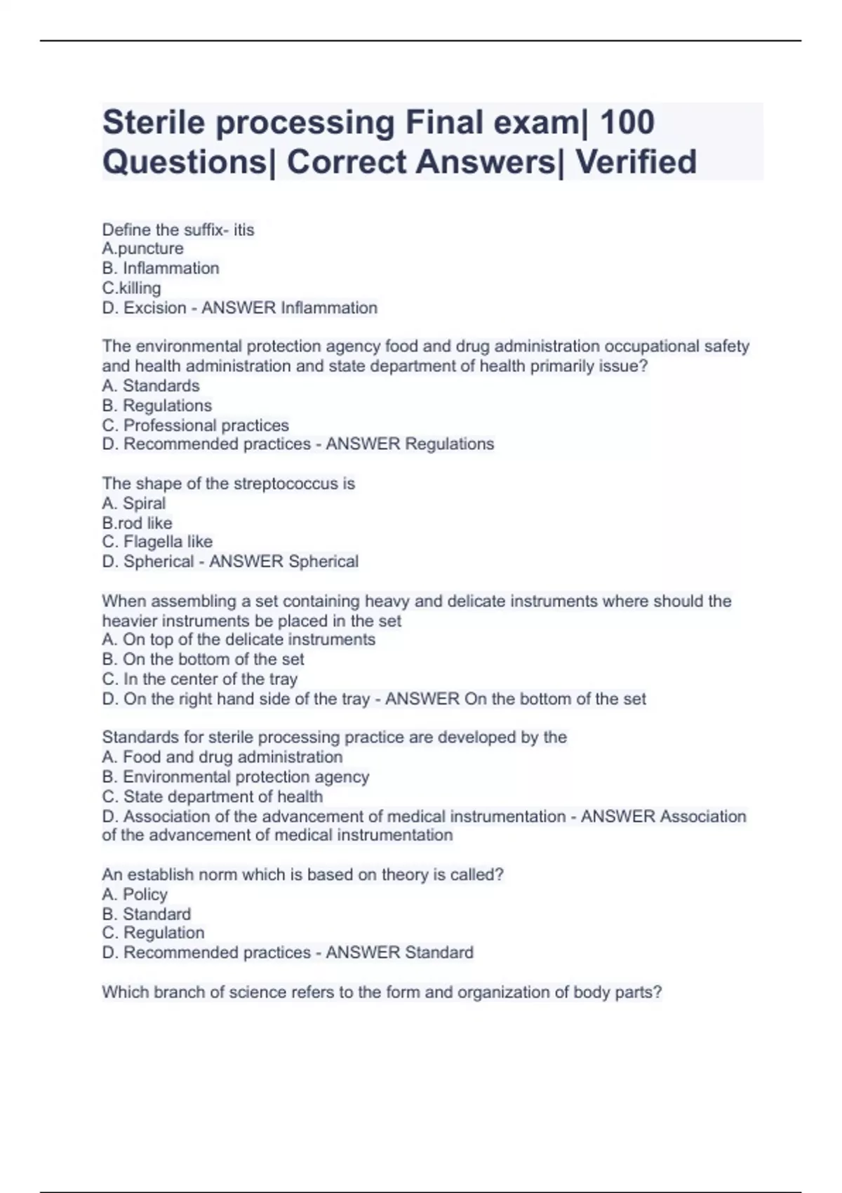 Define the suffix- itis A.puncture B. Inflammation C.killing D. Excision - ANSWER Inflammation The environmental protection agency food and drug administration occupational safety and health administration and state department of health primarily issue? A. Standards B. Regulations C. Professional practices D. Recommended practices - ANSWER Regulations The shape of the streptococcus is A. Spiral B.rod like C. Flagella like D. Spherical - ANSWER Spherical When assembling a set containing heavy and delicate instruments where should the heavier instruments be placed in the set A. On top of the delicate instruments B. On the bottom of the set C. In the center of the tray D. On the right hand side of the tray - ANSWER On the bottom of the set Standards for sterile processing practice are developed by the A. Food and drug administration B. Environmental protection agency C. State department of health D. Association of the advancement of medical instrumentation - ANSWER Association of the advancement of medical instrumentation An establish norm which is based on theory is called? A. Policy B. Standard C. Regulation D. Recommended practices - ANSWER Standard Which branch of science refers to the form and organization of body parts? A. Biology