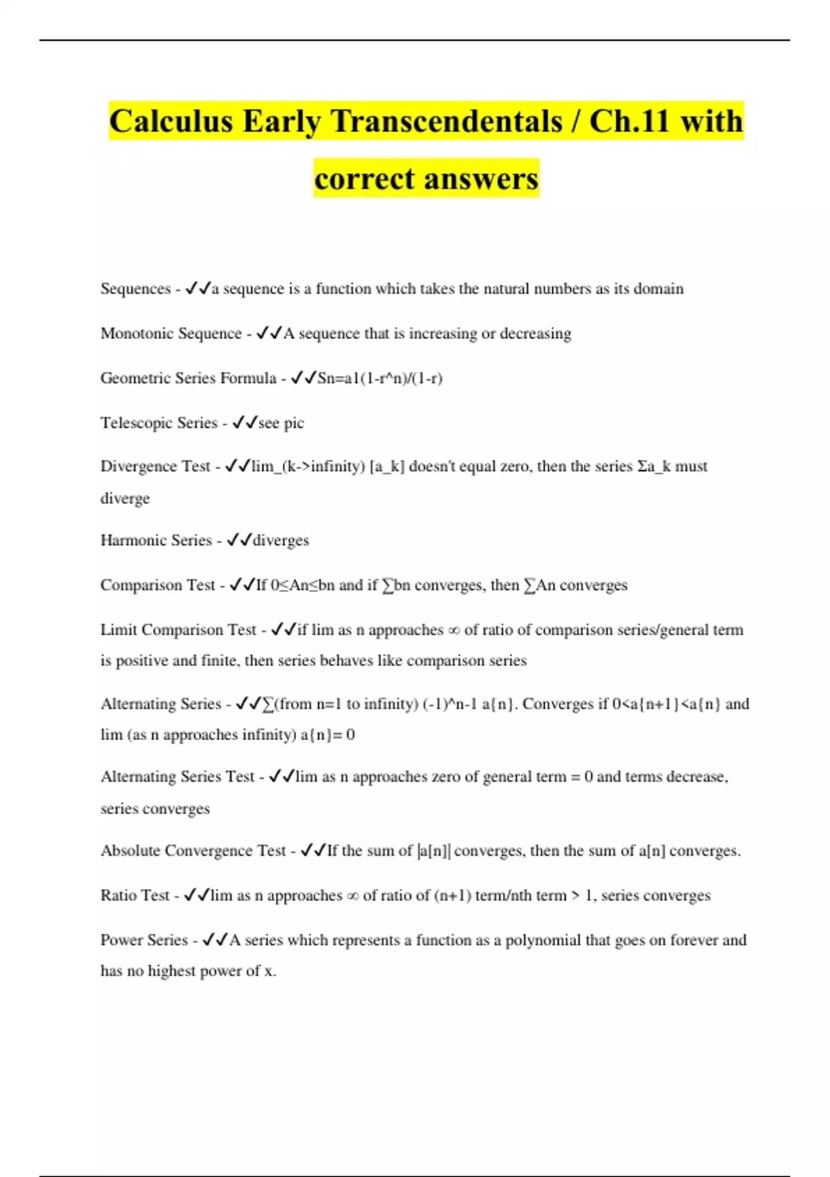 Sequences - a sequence is a function which takes the natural numbers as its domain Monotonic Sequence - A sequence that is increasing or decreasing Geometric Series Formula - Sn=a1(1-r^n)/(1-r) Telescopic Series - see pic Divergence Test - lim_(k->infinity) [a_k] doesn't equal zero, then the series Σa_k must diverge Harmonic Series - diverges Comparison Test - If 0≤An≤bn and if ∑bn converges, then ∑An converges Limit Comparison Test - if lim as n approaches ∞ of ratio of comparison series/general term is positive and finite, then series behaves like comparison series Alternating Series - ∑(from n=1 to infinity) (-1)^n-1 a{n}. Converges if 0<a{n+1}<a{n} and lim (as n approaches infinity) a{n}= 0