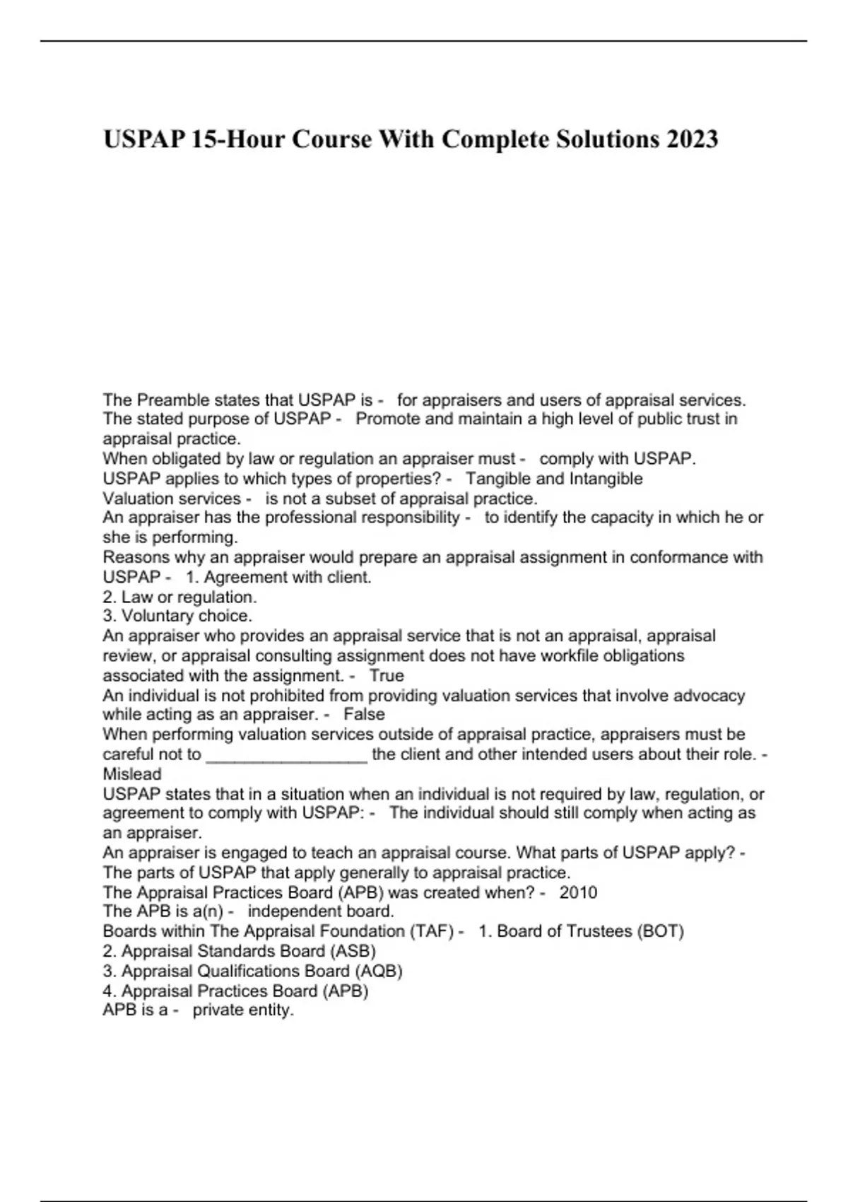USPAP 15-Hour Course With Complete Solutions 2023