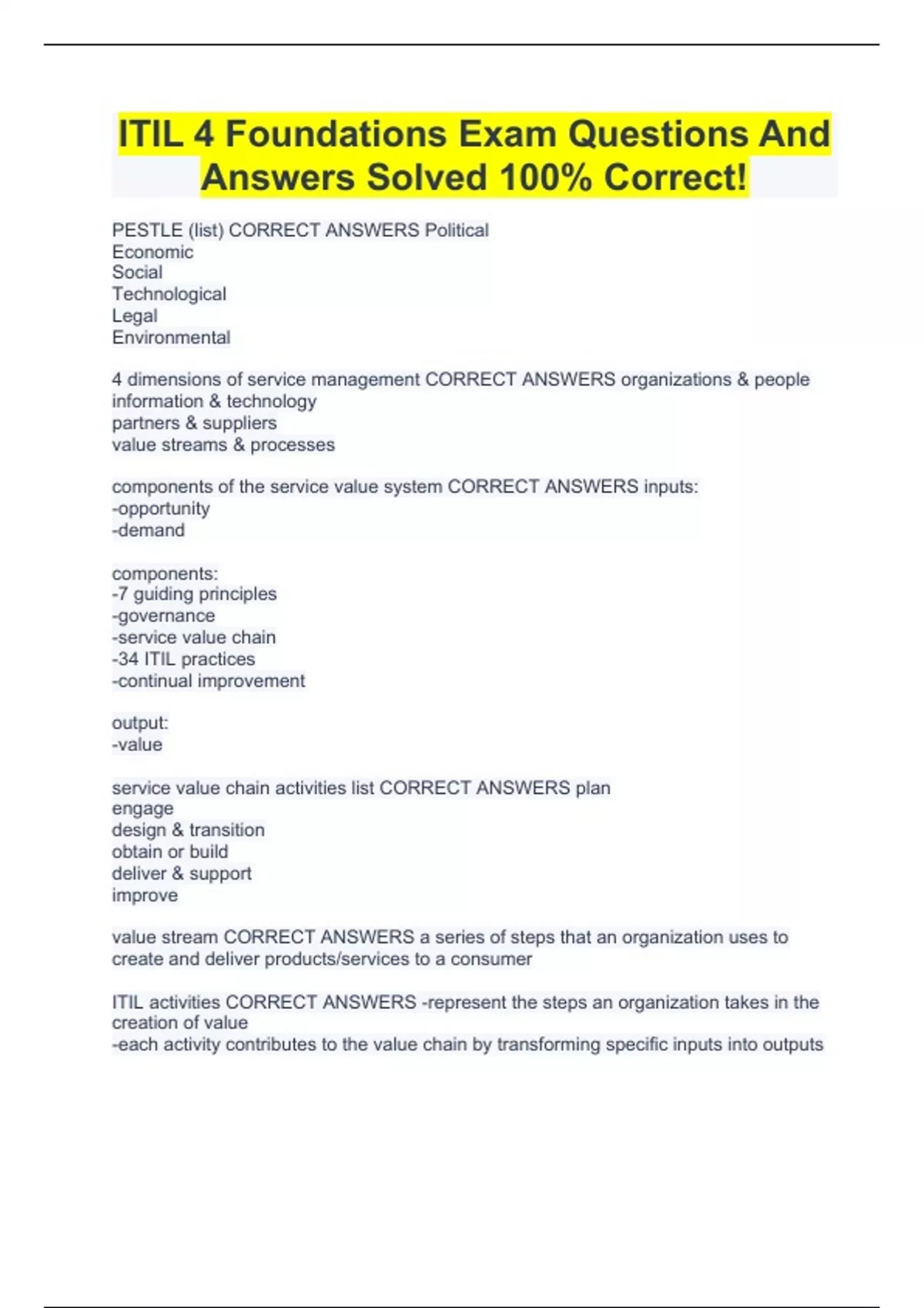 ITIL 4 Foundations Exam Questions And Answers Solved 100% Correct!