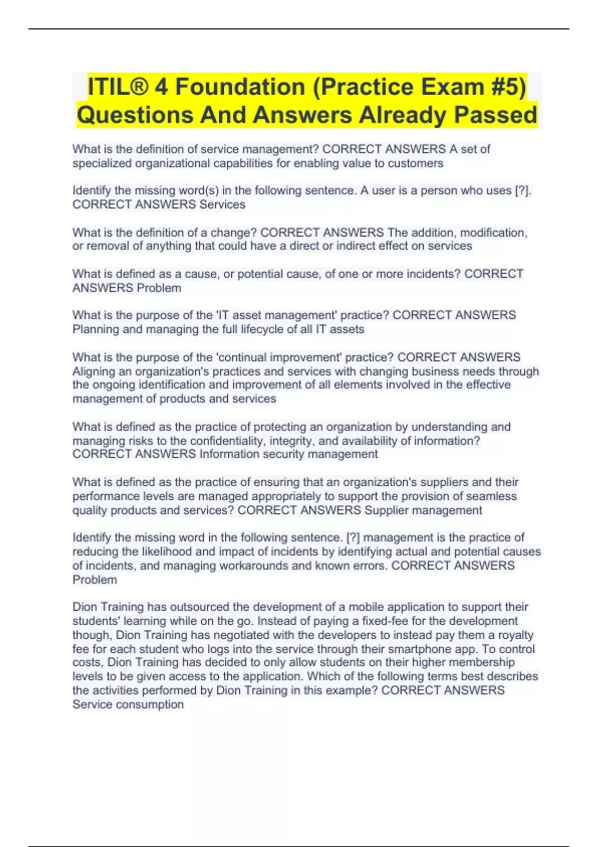 ITIL® 4 Foundation (Practice Exam #5) Questions And Answers Already Passed
