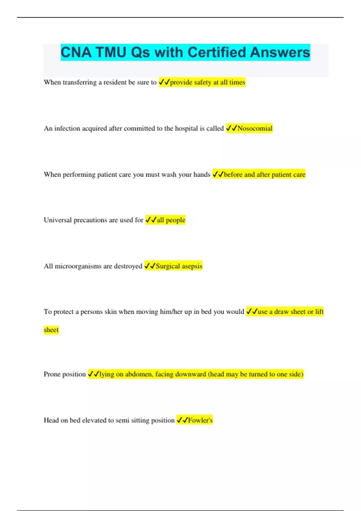 CNA TMU Qs with Certified Answers When transferring a resident be sure to provide safety at all times An infection acquired after committed to the hospital is called Nosocomial When performing patient care you must wash your hands before and after patient care Universal precautions are used for all people All microorganisms are destroyed Surgical asepsis To protect a persons skin when moving him/her up in bed you would use a draw sheet or lift sheet Prone position lying on abdomen, facing downward (head may be turned to one side) Head on bed elevated to semi sitting position Fowler's The most common cause of noise in healthcare facilities The talking and laughing and hallways and on nursing stations The following rules apply when making a bed EXEPT Bring more than enough bed linens When sheets are damp they must be changed Right away You are making an occupied bed. To remove the linens, you should Tuck the bottom linens underneath the patient During a complete bed bath you bathe what part of the body last year Peri- area What should be recorded regarding urine Color , clarity, odor, amount, dysuria Artificial opening of the intestine Colostomy When giving an enema you ask the person to pay on the Left side Edema Body tissues are swollen with water How much fluid do adults need per day to maintain fluid balance 2000 mL to 2500 mL normal blood pressure 130/70 The period of heart muscle contraction is called systole The first sign on decubitus ulcer is Redness and tenderness Heart rate less than 60 bpm bradycardia When heat is applied, the skin is Dialated Most common type of dementia Alzheimer's Disease transmitted through blood, semen, breast milk and vaginal secretions AIDS Hep B is spread Blood, sharing needles and sexual contact What body system does hep b affect Gastro