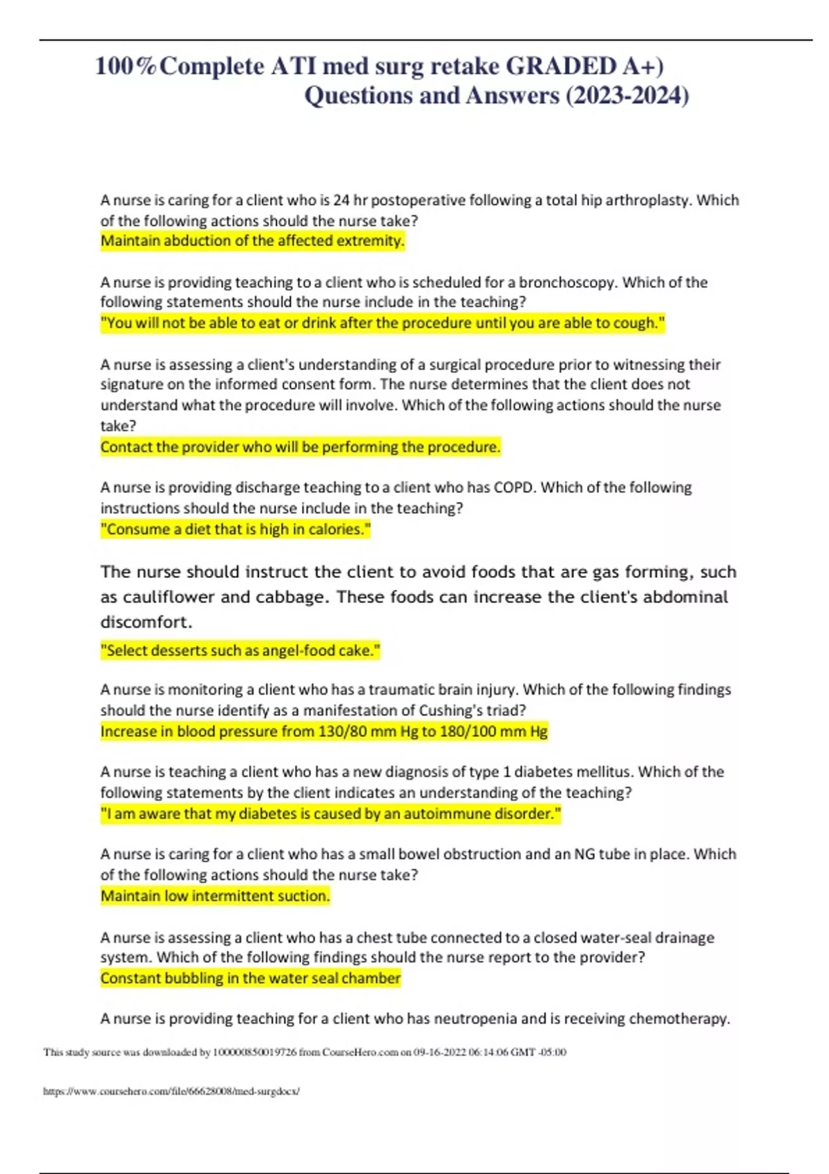 100%Complete ATI med surg retake GRADED A+) Questions and Answers () correctsolution This study source was downloaded by from CourseH on :14:06 GMT -05:00 A nurse is caring for a client who is 24 hr postoperative following a total hip arthroplasty. Which of the following actions should the nurse take? Maintain abduction of the affected extremity. A nurse is providing teaching to a client who isscheduled for a bronchoscopy. Which of the following statements should the nurse include in the teaching? "You will not be able to eat or drink after the procedure until you are able to cough." A nurse is assessing a client's understanding of a surgical procedure prior to witnessing their signature on the informed consent form. The nurse determines that the client does not understand what the procedure will involve. Which of the following actions should the nurse take? Contact the provider who will be performing the procedure. A nurse is providing discharge teaching to a client who has COPD. Which of the following instructions should the nurse include in the teaching? "Consume a diet that is high in calories." The nurse should instruct the client to avoid foods that are gas forming, such as cauliflower and cabbage. These foods can increase the client's abdominal discomfort. "Select dessertssuch as angel-food cake." A nurse is monitoring a client who has a traumatic brain injury. Which of the following findings should the nurse identify as a manifestation of Cushing's triad? Increase in blood pressure from 130/80 mm Hg to 180/100 mm Hg A nurse is teaching a client who has a new diagnosis of type 1 diabetes mellitus. Which of the following statements by the client indicates an understanding of the teaching? "I am aware that my diabetes is caused by an autoimmune disorder." A nurse is caring for a client who has a small bowel obstruction and an NG tube in place. Which of the following actions should the nurse take? Maintain low intermittent suction. A nurse is assessing a client who has a chest tube connected to a closed water-seal drainage system. Which of the following findings should the nurse report to the provider? Constant bubbling in the waterseal chamber A nurse is providing teaching for a client who has neutropenia and is receiving chemotherapy. 100%Complete ATI med surg retake GRADED A+) Questions and Answers () correctsolution This study source was downloaded by from CourseH on :14:06 GMT -05:00 Which of the following client statements indicates an understanding of the teaching? (Select all