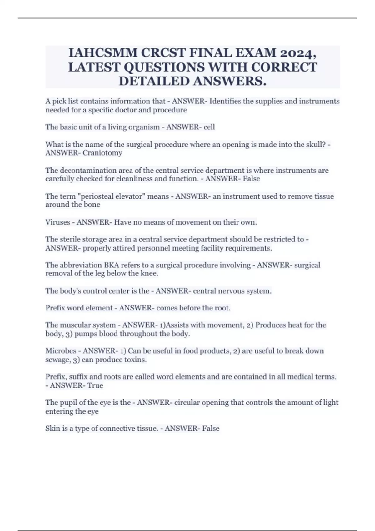 Skin is a type of connective tissue. - ANSWER- False An advantage of centralizing central service management is - ANSWER- allows for maximization of people and services.