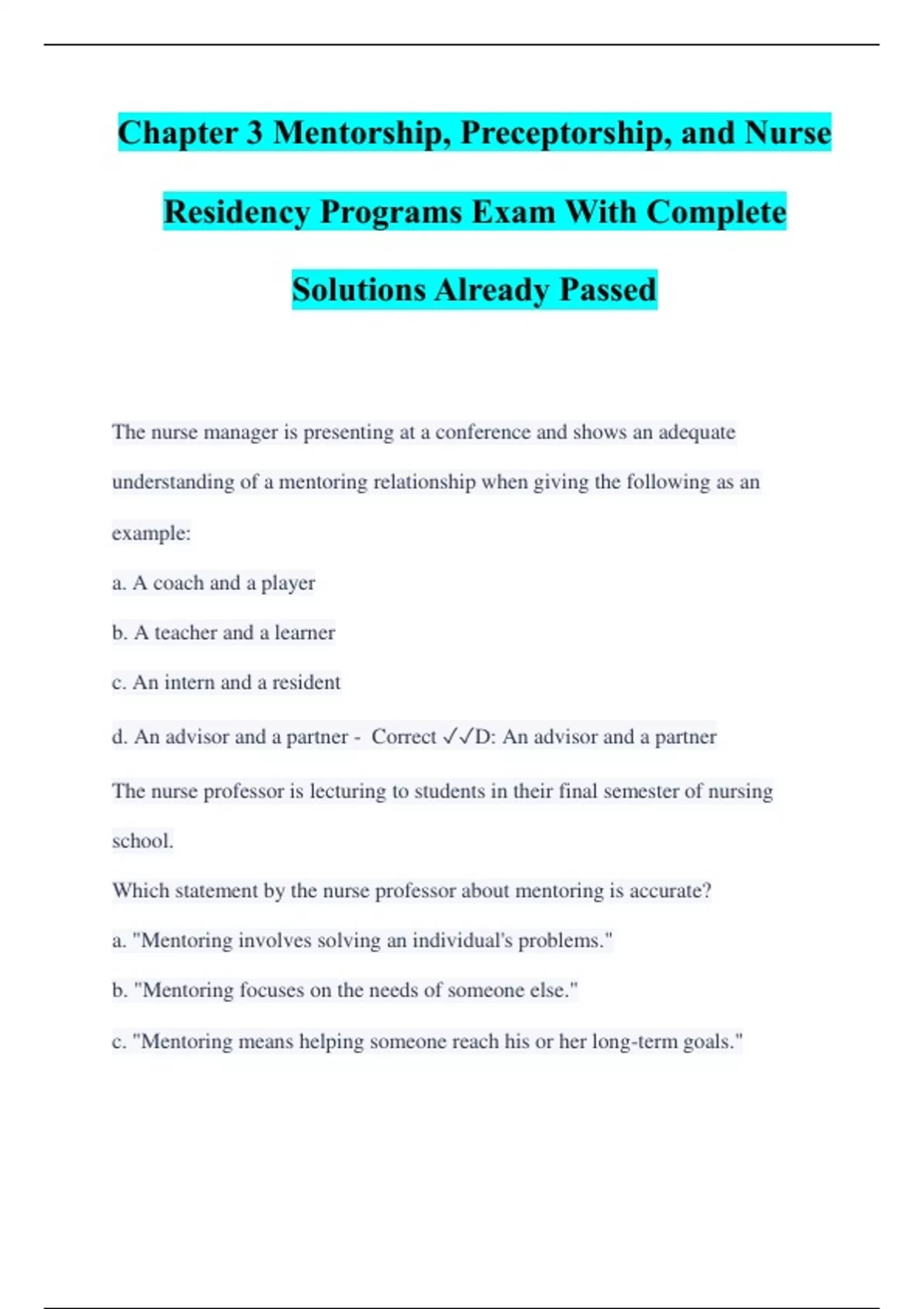 Chapter 3 Mentorship, Preceptorship, and Nurse Residency Programs Exam With Complete Solutions Already Passed