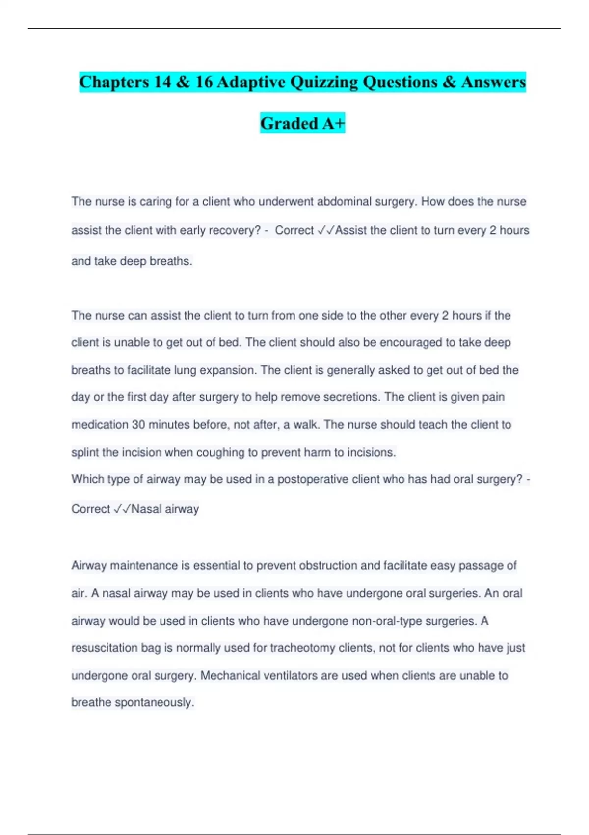The nurse is caring for a client who underwent abdominal surgery. How does the nurse assist the client with early recovery? - Correct Assist the client to turn every 2 hours and take deep breaths. The nurse can assist the client to turn from one side to the other every 2 hours if the client is unable to get out of bed. The client should also be encouraged to take deep breaths to facilitate lung expansion. The client is generally asked to get out of bed the day or the first day after surgery to help remove secretions. The client is given pain medication 30 minutes before, not after, a walk. The nurse should teach the client to splint the incision when coughing to prevent harm to incisions. Which type of airway may be used in a postoperative client who has had oral surgery? - Correct Nasal airway Airway maintenance is essential to prevent obstruction and facilitate easy passage of air. A nasal airway may be used in clients who have undergone oral surgeries. An oral airway would be used in clients who have undergone non-oral-type surgeries. A resuscitation bag is normally used for tracheotomy clients, not for clients who have just undergone oral surgery. Mechanical ventilators are used when clients are unable to breathe spontaneously