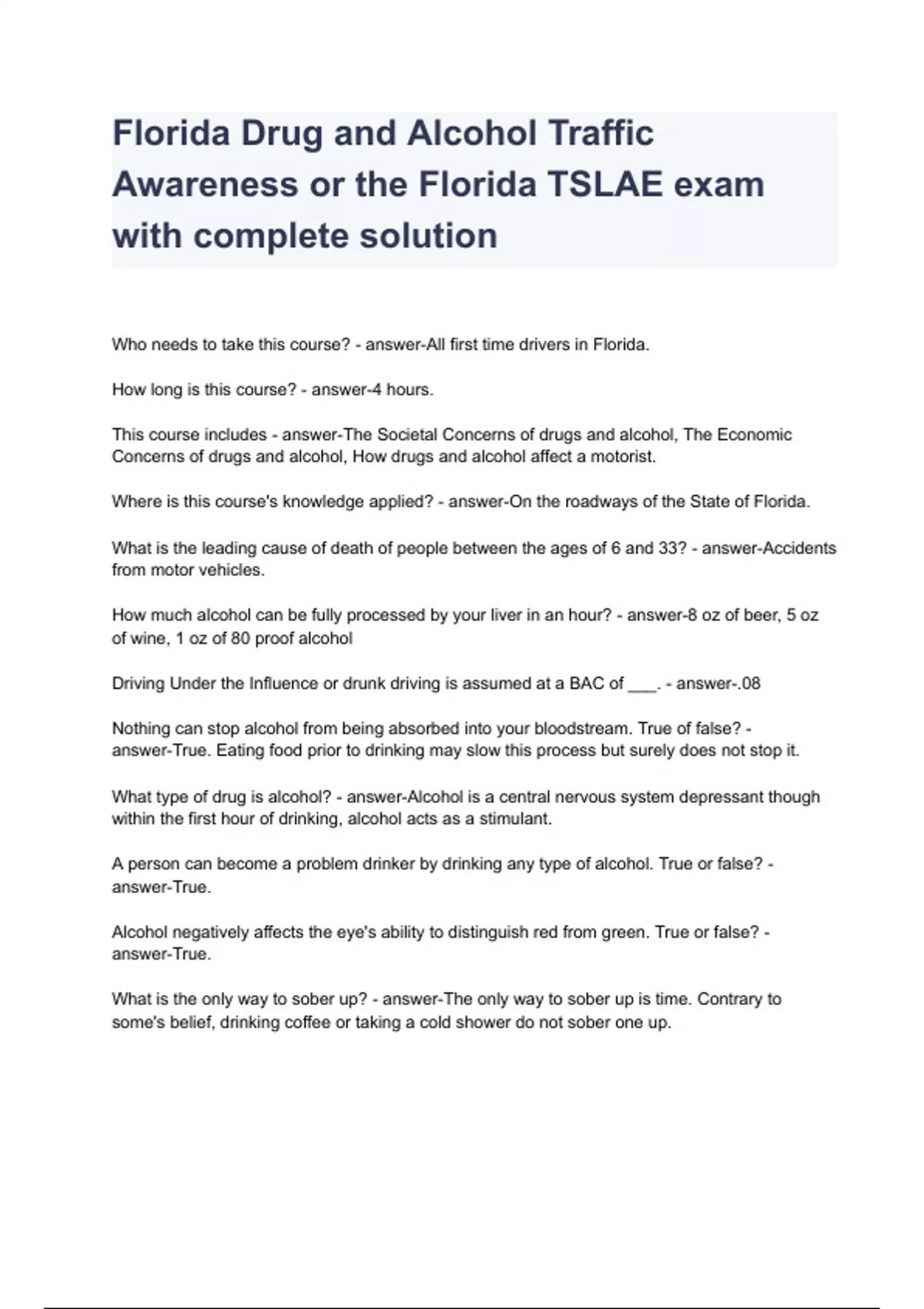 Florida Drug and Alcohol Traffic Awareness or the Florida TSLAE exam with complete solution