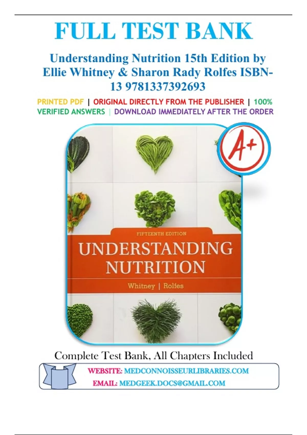 Test Bank for Understanding Nutrition 15th Edition by Ellie Whitney & Sharon Rady Rolfes 9781337392693 Chapter 1-20 | Complete Guide A+. Table of Contents 1. An Overview of Nutrition. Highlight 1: Nutrition Information and Misinformation. 2. Planning a Healthy Diet. Highlight 2: Vegetarian Diets. 3. Digestion, Absorption and Transport. Highlight 3: Common Digestive Problems. 4. The Carbohydrates: Sugars, Starches and Fibers. Highlight 4: Carbs, kCalories and Controversies. 5. The Lipids: Triglycerides, Phospholipids and Sterols. Highlight 5: High-Fat Foods — Friend or Foe? 6. Protein: Amino Acids. Highlight 6: Nutritional Genomics. 7. Energy Metabolism. Highlight 7: Alcohol in the Body. 8. Energy Balance and Body Composition. Highlight 8: Eating Disorders. 9. Weight Management: Overweight, Obesity and Underweight. Highlight 9: The Latest and Greatest Weight-Loss Diet — Again. 10. The Water-Soluble Vitamins: B Vitamins and Vitamin C. Highlight 10: Vitamin and Mineral Supplements. 11. The Fat-Soluble Vitamins, A, D, E and K. Highlight 11: Antioxidant Nutrients in Disease Prevention. 12. Water and the Major Minerals. Highlight 12: Osteoporosis and Calcium. 13. The Trace Minerals. Highlight 13: Phytochemicals and Functional Foods. 14. Fitness: Physical Activity, Nutrients and Body Adaptations. Highlight 14: Supplements as Ergogenic Aids. 15. Life Cycle Nutrition: Pregnancy and Lactation. Highlight 15: Fetal Alcohol Syndrome. 16. Life Cycle Nutrition: Infancy, Childhood and Adolescence. Highlight 16: Childhood Obesity and the Early Development of Chronic Diseases. 17. Life Cycle Nutrition: Adulthood and the Later Years. Highlight 17: Nutrient-Drug Interactions. 18. Diet and Health. Highlight 18: Complementary and Alternative Medicine. 19. Consumer Concerns About Foods and Water. Highlight 19: Food Biotechnology. 20. Hunger and the Global Environment. Highlight 20: Environmentally Friendly Food Choices.