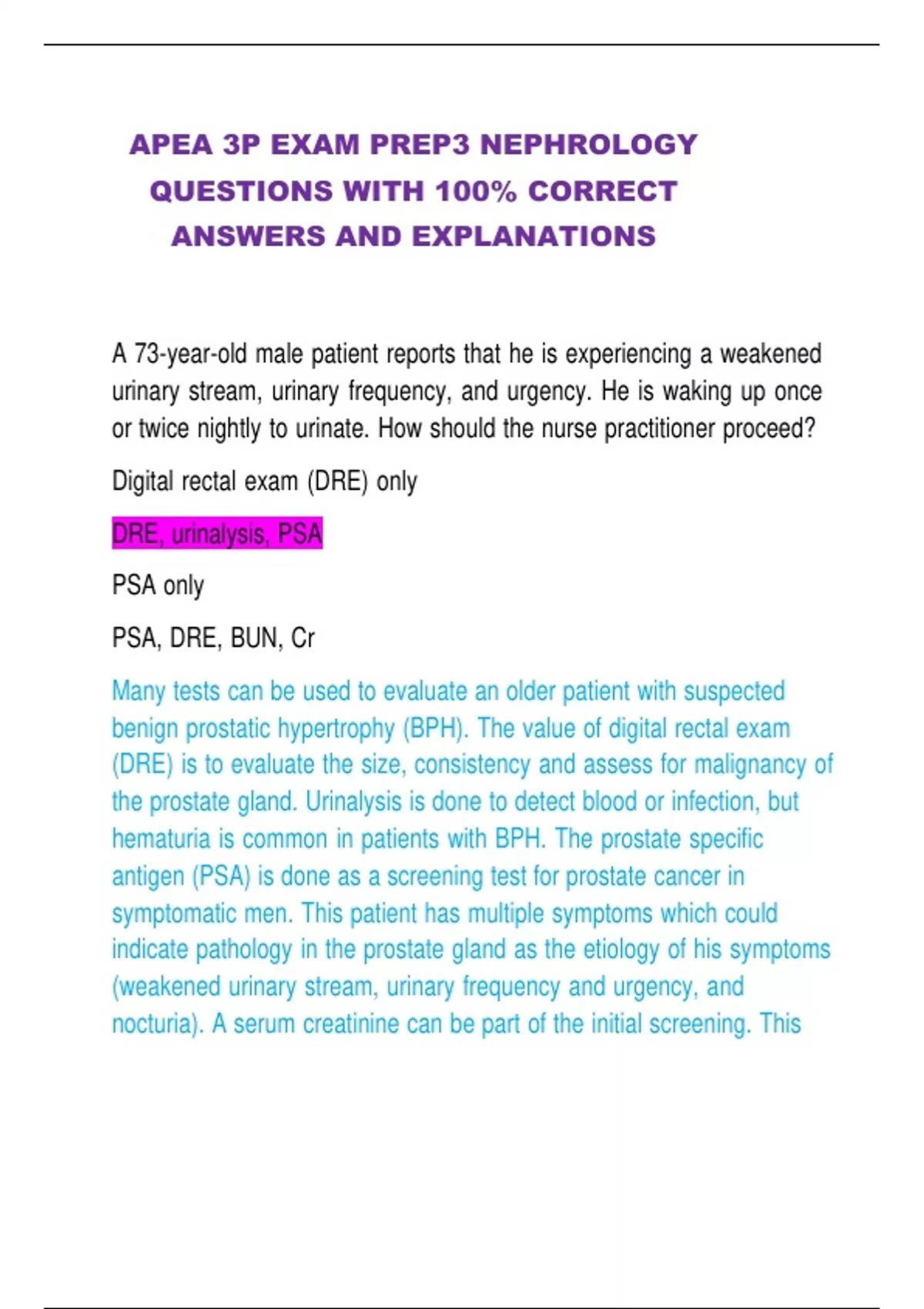 APEA 3P EXAM PREP3 NEPHROLOGY QUESTIONS WITH 100% CORRECT ANSWERS AND EXPLANATIONS A 73-year-old male patient reports that he is experiencing a weakened urinary stream, urinary frequency, and urgency. He is waking up once or twice nightly to urinate. How should the nurse practitioner proceed? Digital rectal exam (DRE) only DRE, urinalysis, PSA PSA only PSA, DRE, BUN, Cr Many tests can be used to evaluate an older patient with suspected benign prostatic hypertrophy (BPH). The value of digital rectal exam (DRE) is to evaluate the size, consistency and assess for malignancy of the prostate gland. Urinalysis is done to detect blood or infection, but hematuria is common in patients with BPH. The prostate specific antigen (PSA) is done as a screening test for prostate cancer in symptomatic men. This patient has multiple symptoms which could indicate pathology in the prostate gland as the etiology of his symptoms (weakened urinary stream, urinary frequency and urgency, and nocturia). A serum creatinine can be part of the initial screening. This would help identify bladder outlet obstruction, renal, or pre-renal disease. A blood urea nitrogen (BUN) is not necessary to evaluate this patient's symptoms. Ciprofloxacin given to treat a urinary tract infection would be contraindicated in a: pregnant patient. 19-year-old female. patient with hypertension. patient with pyelonephritis. Ciprofloxacin is a quinolone antibiotic and is contraindicated in patients who are pregnant or younger than 18 years old because of potential problems with bone and cartilage formation. There is no contraindication in a patient with hypertension. A quinolone might be a good choice in a patient with pyelonephritis and would not be contraindicated. An example of a drug that targets the renin-angiotensin-aldosterone system is a(n): ACE inhibitor. beta blocker. calcium channel blocker. diuretic. Examples of drugs that target the renin-angiotensin-aldosterone system are angiotensin-converting enzyme (ACE) inhibitors and angiotensin receptor blockers (ARBs). These drugs are particularly beneficial to patients with diabetic nephropathy because they may prevent and treat diabetic nephropathy. Additionally, these agents lower blood pressure, which has been shown to be renoprotective. Management of glucose levels and hypertension is especially important in preventing diabetic nephropathy, but so is aggressive management of hyperlipidemia. Testicular torsion can produce: penile erythema. scrotal edema. scrotal erythema. penile edema. Testicular torsion is an emergency because the testicle is deprived of normal blood supply. If blood supply is not reestablished within 12 hours, irreversible damage is certain to occur. Ideally, ischemia is resolved within 4-6 hours. The penis is not affected during testicular torsion. Besides testicular torsion, epididymitis, trauma, and an inguinal hernia are other common causes of scrotal pain.