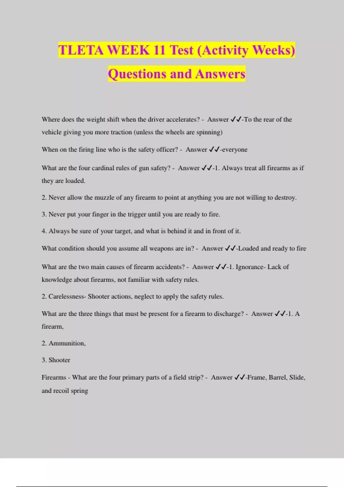 TLETA WEEK 11 Test (Activity Weeks) Questions and Answers Where does the weight shift when the driver accelerates? - Answer ️️ -To the rear of the vehicle giving you more traction (unless the wheels are spinning) When on the firing line who is the safety officer? - Answer ️️ -everyone What are the four cardinal rules of gun safety? - Answer ️️ -1. Always treat all firearms as if they are loaded. 2. Never allow the muzzle of any firearm to point at anything you are not willing to destroy. 3. Never put your finger in the trigger until you are ready to fire. 4. Always be sure of your target, and what is behind it and in front of it. What condition should you assume all weapons are in? - Answer ️️ -Loaded and ready to fire What are the two main causes of firearm accidents? - Answer ️️ -1. Ignorance- Lack of knowledge about firearms, not familiar with safety rules. 2. Carelessness- Shooter actions, neglect to apply the safety rules. What are the three things that must be present for a firearm to discharge? - Answer ️️ -1. A firearm, 2. Ammunition, 3. Shooter Firearms - What are the four primary parts of a field strip? - Answer ️️ -Frame, Barrel, Slide, and recoil spring