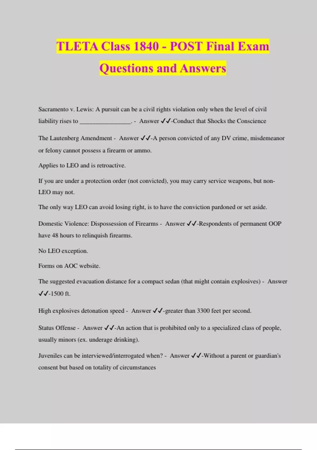 TLETA Class 1840 - POST Final Exam Questions and Answers
