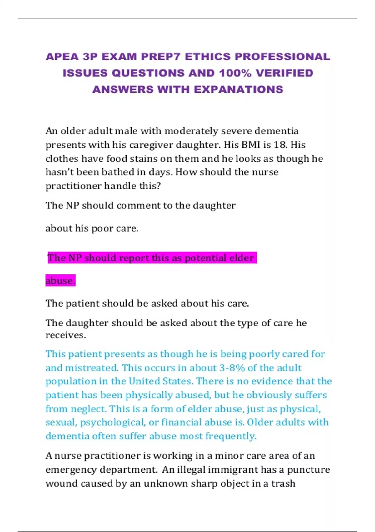 APEA 3P EXAM PREP7 ETHICS PROFESSIONAL ISSUES QUESTIONS AND 100% VERIFIED ANSWERS WITH EXPANATIONS An older adult male with moderately severe dementia presents with his caregiver daughter. His BMI is 18. His clothes have food stains on them and he looks as though he hasn’t been bathed in days. How should the nurse practitioner handle this? The NP should comment to the daughter about his poor care. The NP should report this as potential elder abuse. The patient should be asked about his care. The daughter should be asked about the type of care he receives. This patient presents as though he is being poorly cared for and mistreated. This occurs in about 3-8% of the adult population in the United States. There is no evidence that the patient has been physically abused, but he obviously suffers from neglect. This is a form of elder abuse, just as physical, sexual, psychological, or financial abuse is. Older adults with dementia often suffer abuse most frequently. A nurse practitioner is working in a minor care area of an emergency department. An illegal immigrant has a puncture wound caused by an unknown sharp object in a trash container. A dirty needle is suspected. The nurse practitioner: Should administer a tetanus injection only since the patient has no medical insurance. Should prescribe appropriate medications for HIV exposure even though the nurse practitioner knows the patient can’t afford them. Should not mention the possibility of HIV exposure from a dirty needle to the patient. Can offer to buy the HIV medications for $50 with their professional discount at the pharmacy next door. The standard of care followed by the nurse practitioner should not depend on whether the patient has insurance or not. It is unethical to not properly inform the patient of risks he may have been exposed to from the puncture wound. Offering to buy the medications for the patient is noble but is not a sustainable practice. The nurse practitioner should prescribe the medications as for anyone with possible HIV exposure and refer to social services or a community referral agency that can help this patient acquire the appropriate medications. A nurse practitioner is working in a minor care clinic. She realizes that a patient with a minor laceration does not have insurance and is using his brother’s insurance information today so that his visit will be covered. How should she proceed? She should let him know that she knows what he is doing. She should ignore this and proceed to suture his wound. She should let the clinic's business office know what is happening. She should not suture his wound and ask him to leave. The nurse practitioner cannot ignore the fact that this patient is attempting to defraud the clinic and insurance company in order to receive free care. If she does not let the business office know, she is a party to the fraud. She should let the business office know what is happening and have the patient present documents verifying that he is who he states that he is. If he cannot, he can still receive care if he is willing to pay for it. An alternative care site should be offered to him.