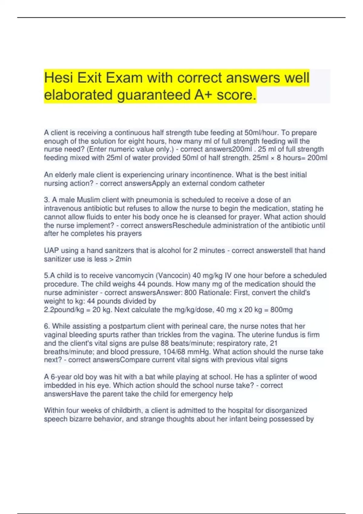 Hesi Exit Exam with correct answers well elaborated guaranteed A+ score. A client is receiving a continuous half strength tube feeding at 50ml/hour. To prepare enough of the solution for eight hours, how many ml of full strength feeding will the nurse need? (Enter numeric value only.) - correct answers200ml . 25 ml of full strength feeding mixed with 25ml of water provided 50ml of half strength. 25ml × 8 hours= 200ml An elderly male client is experiencing urinary incontinence. What is the best initial nursing action? - correct answersApply an external condom catheter 3. A male Muslim client with pneumonia is scheduled to receive a dose of an intravenous antibiotic but refuses to allow the nurse to begin the medication, stating he cannot allow fluids to enter his body once he is cleansed for prayer. What action should the nurse implement? - correct answersReschedule administration of the antibiotic until after he completes his prayers UAP using a hand sanitzers that is alcohol for 2 minutes - correct answerstell that hand sanitizer use is less > 2min 5.A child is to receive vancomycin (Vancocin) 40 mg/kg IV one hour before a scheduled procedure. The child weighs 44 pounds. How many mg of the medication should the nurse administer - correct answersAnswer: 800 Rationale: First, convert the child's weight to kg: 44 pounds divided by 2.2pound/kg = 20 kg. Next calculate the mg/kg/dose, 40 mg x 20 kg = 800mg 6. While assisting a postpartum client with perineal care, the nurse notes that her vaginal bleeding spurts rather than trickles from the vagina. The uterine fundus is firm and the client's vital signs are pulse 88 beats/minute; respiratory rate, 21 breaths/minute; and blood pressure, 104/68 mmHg. What action should the nurse take next? - correct answersCompare current vital signs with previous vital signs A 6-year old boy was hit with a bat while playing at school. He has a splinter of wood imbedded in his eye. Which action should the school nurse take? - correct answersHave the parent take the child for emergency help Within four weeks of childbirth, a client is admitted to the hospital for disorganized speech bizarre behavior, and strange thoughts about her infant being possessed by demons. The nurse identifies a nursing diagnosis of "Altered thought processes, secondary to" what condition? - correct answersPostpartum psychosis The nurse identifies a priority diagnosis of, "Altered comfort related to menstrual cramps" for a 25-year-old female client. Which self-care activity should the nurse emphasize in the client's teaching plan? - correct answersRegular aerobic exercise. Psych/Alcohol/Tylenol overdose antidote - correct answersGive Mucomyst Medical Surgical/Laxative abuses - correct answersPatient -taking Milk of Magnesium Spiritual/Documentation - correct answersNative American - Allow pt's family to stay in the room Leadership- Interpreter informed consent - correct answersPt should sign the consent Geriatrics/Emergency Rib fractures fall - correct answersPulmonary embolism A client diagnosed with major depression is being allowed a weekend pass from the psychiatric unit. Which instruction should the nurse provide to the client's family? - correct answersInvolve the client in usual at home activities Upon assessment, the nurse discovers that a postpartum client has persistent red lochia. Which of the following does this assessment finding suggest to the nurse? - correct answersCoagulation disorders The healthcare provider performs peritoneal dialysis on a client, after which 2 liters of fluid is drained. What action should the nurse complete first? - correct answersAssess vital signs. After administering a medication through a nasogastric tube connected to suction, what action should the nurse take first? - correct answersClamp the tube The nurse is caring for four clients: Client A 94% o2 saturation, Client B, hemoglobin of 8.; Client C, potassium level of 3.8 and Client D appendectomy who has a white blood cell count of 15,000. What should the nurse implement? - correct answersDetermine if Client B has two units of packed cells available in the blood bank. Triage question with a train wreck The psychiatric nurse is called to a train derailment that was likely caused by a terrorist bomb. In triaging those in need of immediate care, what is the priority ranking for these cases?
