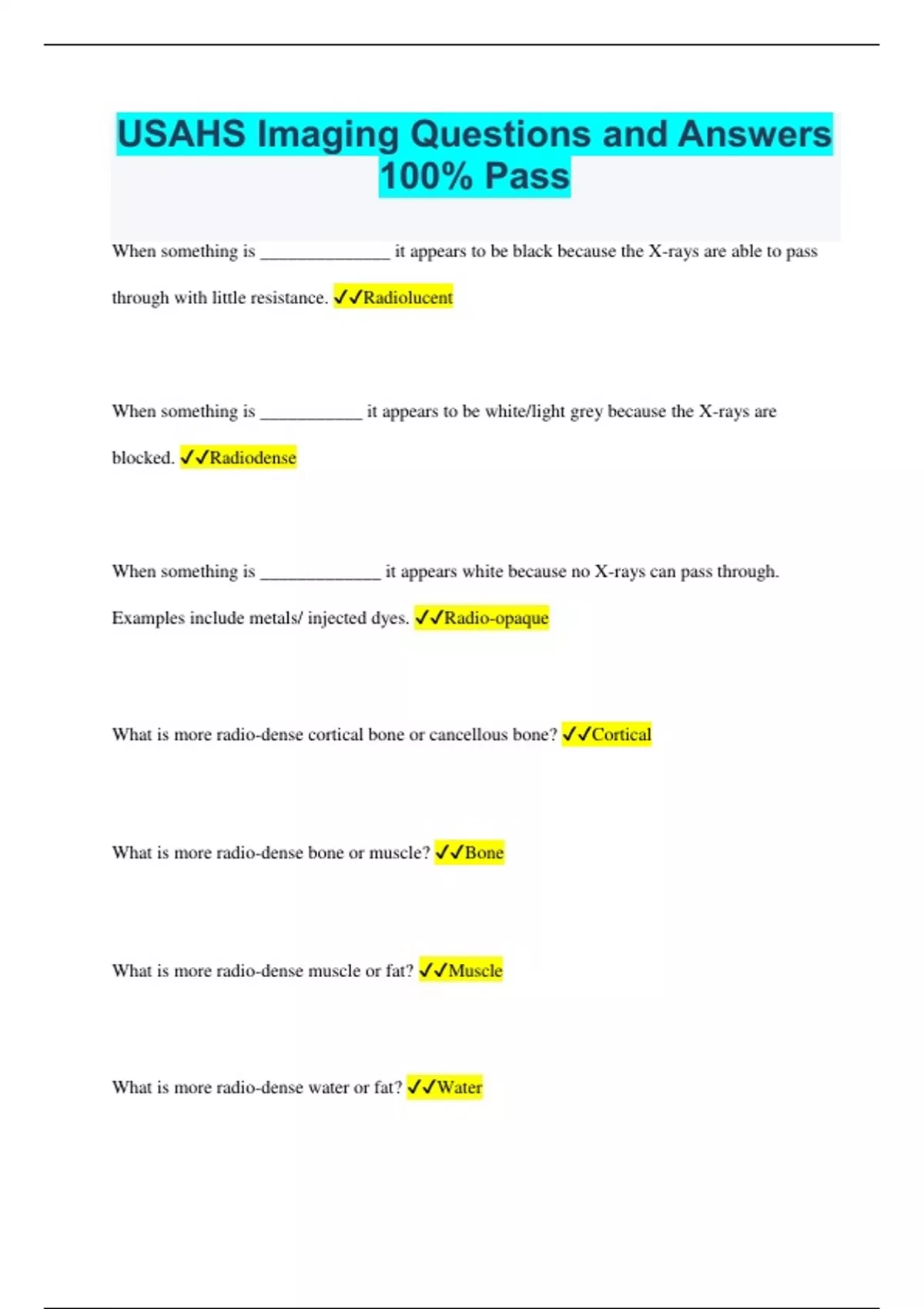 USAHS Imaging Questions and Answers 100% Pass When something is ______________ it appears to be black because the X-rays are able to pass through with little resistance. Radiolucent When something is ___________ it appears to be white/light grey because the X-rays are blocked. Radiodense When something is _____________ it appears white because no X-rays can pass through. Examples include metals/ injected dyes. Radio-opaque What is more radio-dense cortical bone or cancellous bone? Cortical What is more radio-dense bone or muscle? Bone What is more radio-dense muscle or fat? Muscle What is more radio-dense water or fat? Water Short exposure time and low milliamperes on an X-ray _______________ radiodensity. Increase Standard distances from the X-ray tube for the best quality are ____ inches for skeletal and ____ inches for the chest. 40, 72 ______ is the modality of choice for viewing bone, the best for evaluating loose bodies and subtle/complex fractures. Also the best for the evaluation of spinal degeneration. CT ______ does not use radiation. This is the superior method for soft tissue detail and certain bone pathologies. MRI How does MRI produce images? From the emission of energy from the protons in the body (NOT from the absorption of X-rays) T1 imaging signal is caught ______ emphasizing fat. Early T2 imaging signal is caught ______ emphasizing fluid. Late In a T1 MRI the ______ is bright Fat (in T2 the fluid is bright) How can you use the cortex of a bone to determine if it is a CT scan or MRI? If they cortex of the bone is bright it is a CT scan What is the difference between T1 and T2 weighted images? Time to echo (TE) and time to repetition (TR) On an MRI cortical bone has a very _____ signal T1 & T2. Low On an MRI red bone marrow has an ____________ signal on T1. Intermediate On an MRI yellow bone marrow has a _________ signal intensity on T1. High On an MRI bone marrow comes out _______ on T2. Dark On an MRI muscles have an ___________ signal intensity on both T1 and T2; slightly darker on T2. Intermediate On an MRI tendons/ligs/menisci will have a ______ signal on T1 and T2 if healthy. Low On an MRI cartilage has an ___________ signal on T1 and T2. Intermediate A T1 weighted image is made by employing a short TE and TR, fat releases energy _______ than water therefore fat appears white. Faster In both T1 and T2 dense structures such as cortical bones, tendons, and ligaments appear _________. Dark In regards to ultrasound, hyperechoic tissues appear _______ than surrounding tissues. Brighter In regards to ultrasound, hypoechoic tissues appear ______ ______ than the surrounding tissues. Less bright In regards to ultrasound, anechoid tissues appear _______ because there is so signal. Black (bone > lig > tendon > nerve > fat > muscles > water) Ultrasound is best for _________ and _________. Ligaments and tendons (dynamic imagining is a plus as well) In regards to ultrasound the higher the frequency the ________ the image. Better Explain curvilinear transducers. Used for abdomen and pelvis, images are angled because the beam diverges, this divergence causes the deepest structures are seen as proportionally larger Osteophytes, sclerosis, subchondrial cysts, joint space narrowing, effusion, erosions, deformities, fusion, bone marrow edema. One joint inflamed = _____________ Infection Two joints inflamed is ___________ _____________ Inflammatory arthritis Proximal joints of hand, no bony proliferation, and more than one joint involved is _____________ ____________. Rheumatoid arthritis Distal joints of hand, bony proliferation, and greater than one joint involved is what? Seronegative spondyloarthropathy _____________ narrowing = osteophytes and sclerosis Asymmetric Neuropathic hemophilia is linked to ___________ ____________. Atypical arthritis Osteophytes are one of the hallmarks of OA, what causes them? Forces pulling on bone, capsular/lig. Attachments also at direct bony contacts _________ is increased bone density adjacent to joint surfaces. Sclerosis (due to loss of cartilage) ____________ __________ are more common in OA than RA, due to increased fluid pressure, fissuring of cartilage. Subchondral cysts Uniform joint space narrowing in __________ arthritis. RA Effusion is a hallmark of ____________ arthritis. Inflammatory (synovial hypertrophy is associated with synovitis; proliferation of pannus destroys cartilage. Trophi specific to gout. Erosions are a sign of inflammatory arthritis due to ________ _____________. Synovial proliferation (RA) or crystal deposits, other causes are post trauma and chronic overload True or false: Deformities are a hallmark of inflammatory arthritis and late stage OA. True Joint surface/ margin changes OA and RA? OA- heberdens RA- psoriatic arthritis (pencil in cup) __________ is the end product of many forms initially fibrous and results in ossesous formations. Fusion __________ __________ ___________ happens in all forms of arthritis and can explain sx and guide POC. Bone marrow edema (seen as increased density on radiograph, best diagnosed with MRI) areas of increased signal intensity on T2 and decreased on T1 80% of all arthritis is _____. OA Osteophytes = _____, erosions = ______. Osteo= OA Erosions= ra true or false: RA erosions are NOT the result of joint loading or articular stresses. True (found in joint areas not covered by cartilage and the product of pannus formation _______ appear as radiolucent circles deep to articular surfaces. Cysts What are Greenspan's 7? Site and extent of fracture (open or closed) Complete or incomplete Relationship of fragments Direction of the fracture line Special features (impaction, avulsion) Associated abnormalities (joint dislocations) Special types (stress, pathological) In regards to relationship of fragments the __________ is the degree of opposition at osseous ends. Abnormal = displacement. Position In regards to relationship of fragments the _____________ is the angular relationship; one fragment 
