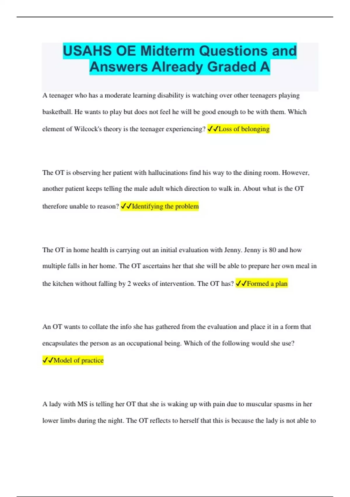 USAHS OE Midterm Questions and Answers Already Graded A A teenager who has a moderate learning disability is watching over other teenagers playing basketball. He wants to play but does not feel he will be good enough to be with them. Which element of Wilcock's theory is the teenager experiencing? Loss of belonging The OT is observing her patient with hallucinations find his way to the dining room. However, another patient keeps telling the male adult which direction to walk in. About what is the OT therefore unable to reason? Identifying the problem The OT in home health is carrying out an initial evaluation with Jenny. Jenny is 80 and how multiple falls in her home. The OT ascertains her that she will be able to prepare her own meal in the kitchen without falling by 2 weeks of intervention. The OT has? Formed a plan An OT wants to collate the info she has gathered from the evaluation and place it in a form that encapsulates the person as an occupational being. Which of the following would she use? Model of practice A lady with MS is telling her OT that she is waking up with pain due to muscular spasms in her lower limbs during the night. The OT reflects to herself that this is because the lady is not able to change her position independently in bed at night. This is an example of the OT reasoning through a ? Hypothesis Models of practice Referral (first notification of client) Collect cues and information Process information Identify problems (occupational barriers) Establish goals Frames of reference Form a plan Take action Evaluate outcomes Discharge (when a client leaves) Applying OT models and frames in clinical reasoning Circle of clinical reasoning and explains how OT delivers clinical reasoning Models of practice and frames of reference How theory applies in OT Paradigm (belief/value/current trend of thinking. Can change with the time period) Philosophy (core understanding/assumptions. Centered around engagement) Models of practice Frames of reference Intervention OT theory by wilcock Doing-taking part in purposeful activity Being-taking time to reflect and appreciate the meaning and value Becoming-Envisioning our future and what we wish to become Belonging-The sense of being included and accepted How does models and framework fit into our theory -Overachieving theory -Helps OT compartmentalize all the elements of the client -Theories link elements together -So this theory provides the links to enable OT to make required links and formulate a total picture focused on OT engagement -The therapist will select the most appropriate model for the patient -From identifying the problems the frames of reference are now relevant, as these are how we clinically reason what interventions we can deliver and how we deliver them Models of Human Occupation (MOHO) -Views the person as an open ended system -Always interacting with the environment and adapting to the changes the environment might pose -3 subsystems help view patient as occupational being 1. performance capacity 2. habituation 3. volition -^^^^^^^ the 3 core of a person Performance capacity -Referred to as the mind, brain, body, connection 1. input (individuals receiving info. from environment) 2. throughput (info gets processed or changes are made) 3. output (once change is made, person will perform action) 4. feedback (always receiving feedback from environment as their own actions, and as such were constantly changing and adapting to how we do things) MOHO -Most widely used occupation based model in practice worldwide -Occupational focused, evidence based and client centered approach to OT practice -Concerned with how people can participate in daily life -Process in which practitioners support client engagement in occupations The person as viewed by MOHO Person -performance -skill Environment ^^^^^ occupational identity occupational adaptation occupational competency Volition Personal causation (how person views themselves in what they can/cannot do) Values Interests Habituation Habits (influences and assists in establishing routine) Roles (part of our identity and who are are Example- waking up everyday and going to school because I am a student Performance capacity The capacity to do something depends on the following 2 factors -body systems -mental or cognitive abilities MOHO concepts related to environment Engagement in occupation Environment MOHO and Occupational Engagement 3 levels at which we can examine what a person does 1. occupational participation 2. occupational performance 3. skills 6 steps of therapeutic reasoning Gathering (gathering info on a client) Using (using info gathered to create explanation of the clients info) Generating (generating goals and strategies) Implementing and monitoring (monitoring therapy) Determining (determining outcomes of therapy) MOHO in own words A model that looks at our client and the occupation, as well as their motivations, their habits, their routines, and their rituals and how that interplays with the environment We are really looking at what motivates our client from an individual perspective Occupational competency Degree to which one is able to sustain a pattern of occupational participation that reflects ones occupational participation that reflects ones occupational identity Occupational identity A composite sense of who one is and wishes to become as an occupational being generated from ones occupational history Occupational adaptation Constructing a positive occupational identity and achieving occupational competence over time in the context of ones environment Bill, a police officer, is returning to work after a serious injury to his right, dominant hand. He is anxious about being able to safely perform his job duties after returning to work. Bill is struggling with which component of volition? Personal causation The model of human occupation is an occupation-focused approach to OT practice that is also all of the following except: Diagnostic process In MOHO, ___________