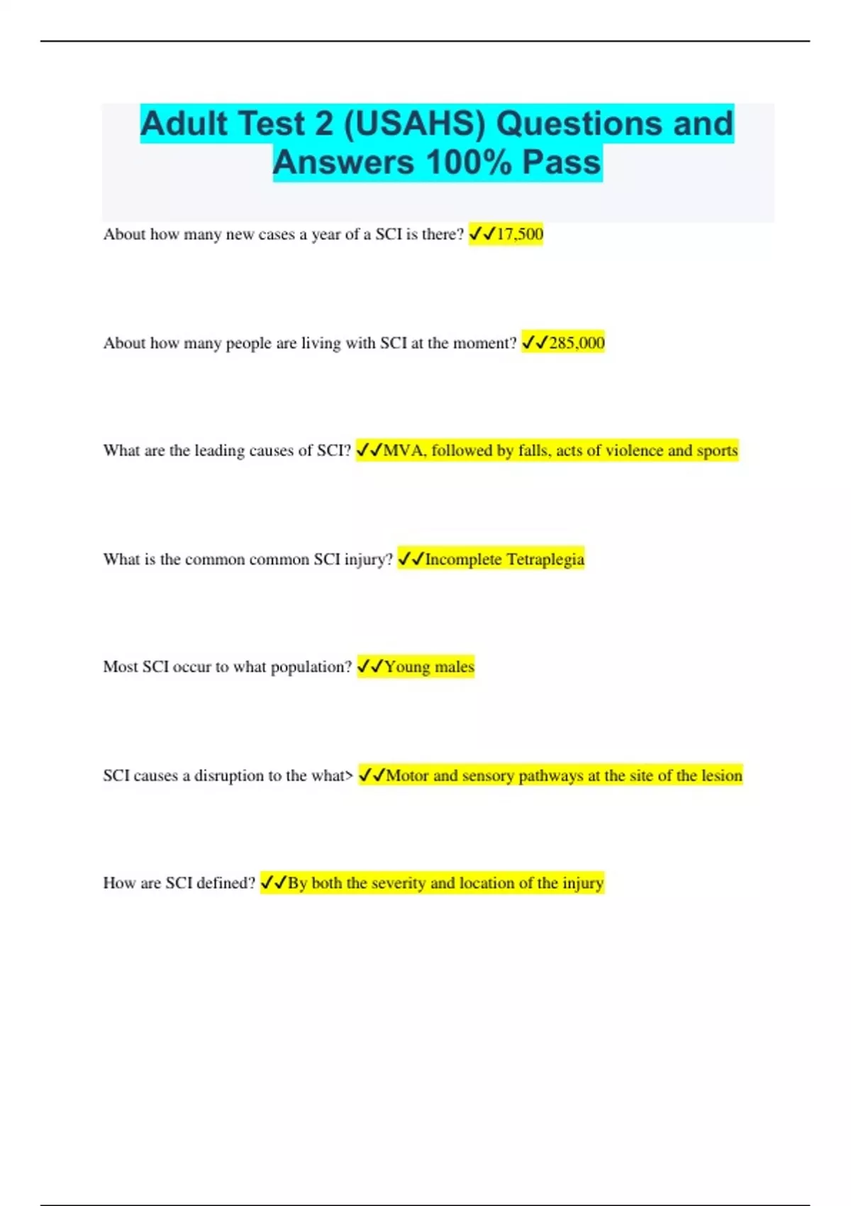 Adult Test 2 (USAHS) Questions and Answers 100% Pass About how many new cases a year of a SCI is there? 17,500 About how many people are living with SCI at the moment? 285,000 What are the leading causes of SCI? MVA, followed by falls, acts of violence and sports What is the common common SCI injury? Incomplete Tetraplegia Most SCI occur to what population? Young males SCI causes a disruption to the what> Motor and sensory pathways at the site of the lesion How are SCI defined? By both the severity and location of the injury Neurological level SCI is classified by? The lowest (most caudal) level of the spinal cord with normal sensory and motor function bilaterall When doing ASIA testing you should test? Both sides all the way down ASIA A complete, no sensory or motor function is preserved in the sacral segments S4-S5 ASIA B Incomplete; sensory but not motor function is preserved below the neurological level and includes the sacral segments S4-5 ASIA C Incomplete; motor function is preserved below the level of injury with most of the muscle strength <3/5 ASIA D Incomplete; motor function is preserved below the level of injury with most of the muscle strength >3/5 AISA E Normal Tetraplega - injury to cervical SC - Impaired upper extremity function, trunk and lower extremity function Paraplegia Impaired lower extremity function and possibly trunk Your patient sustained an injury to the central structures of the spinal cord that produces sacral sensory sparing and greater weakness in the upper limbs than in the lower limbs. What SCI is this? Central Cord Anterior cord syndrome Incomplete spinal injury in which all functions are absent below the level of except proprioception and sensation Your patient presents with an incomplete spinal cord injury where half of the cord has been damaged. Exhibit more loss of motor and proprioceptive ipsilateral to injury and loss of pain and sense of temperature on contralateral side. What SCI is this? Brown-Seqaurd Conus Medullaris Syndrome Injury to the sacral cord resulting in flaccid paralysis of the lower extremities Your patient sustained injury to the lumbar and sacral nerves roots results in flaccid-type paralysis Pattern of paralysis varies. What SCI is this? Cauda Equina Syndrome What are some of the common tests for SCI? - ROM -SCI - MAS - GRASSP Spinal Cord Independence Measure Questionnaire regarding functional independence for patients with SCI Modified Ashworth Scale To test for abnormal tone; apply quick stretch to muscle so it is lengthened quickly Graded Redefined Assessment of Strength, Sensibility and Prehension (GRASSP) Measures hand fxn (used for tetraplegia) What are some complications that are related to SCI? - Autonomic dysreflexia