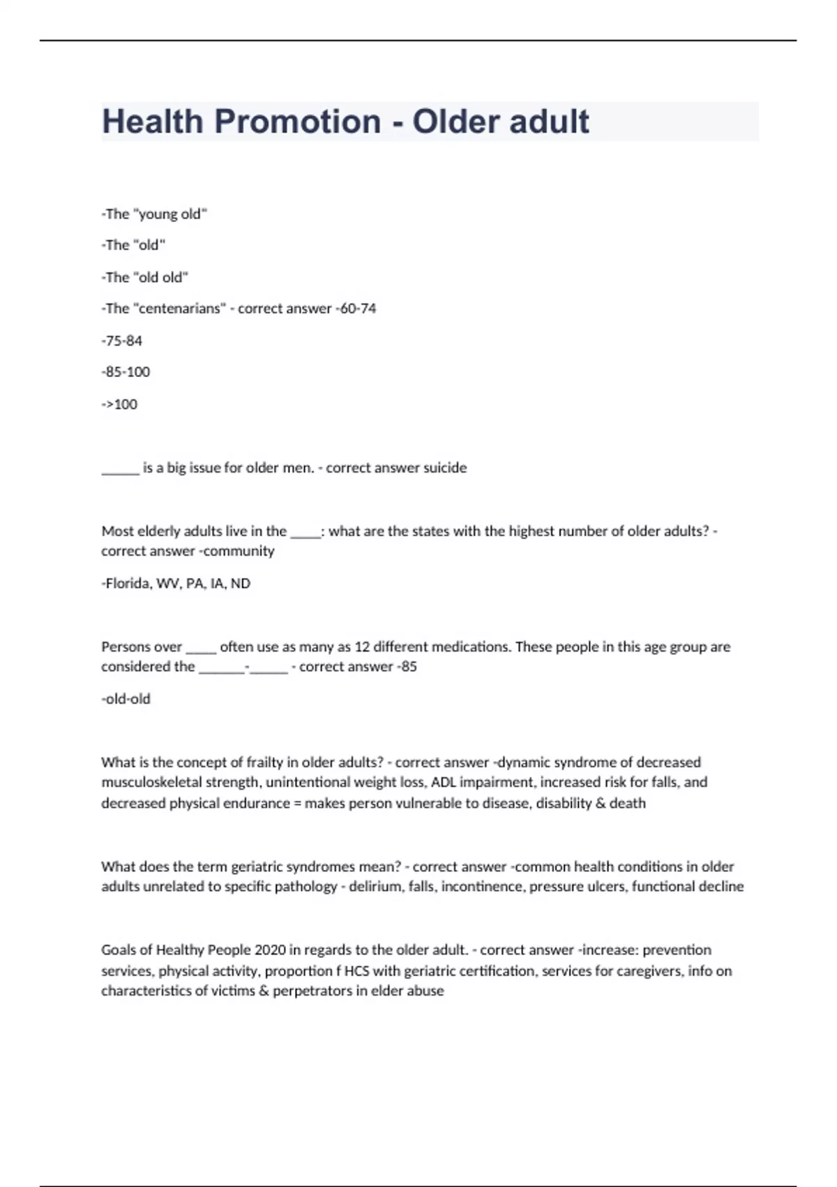 Health Promotion - Older adult -The "young old" -The "old" -The "old old" -The "centenarians" - correct answer -60-74 -75-84 -85-100 ->100 _____ is a big issue for older men. - correct answer suicide Most elderly adults live in the ____: what are the states with the highest number of older adults? - correct answer -community -Florida, WV, PA, IA, ND Persons over ____ often use as many as 12 different medications. These people in this age group are considered the ______-_____ - correct answer -85 -old-old What is the concept of frailty in older adults? - correct answer -dynamic syndrome of decreased musculoskeletal strength, unintentional weight loss, ADL impairment, increased risk for falls, and decreased physical endurance = makes person vulnerable to disease, disability & death What does the term geriatric syndromes mean? - correct answer -common health conditions in older adults unrelated to specific pathology - delirium, falls, incontinence, pressure ulcers, functional decline Goals of Healthy People 2020 in regards to the older adult. - correct answer -increase: prevention services, physical activity, proportion f HCS with geriatric certification, services for caregivers, info on characteristics of victims & perpetrators in elder abuse -decrease: rate of pressure ulcers in hospital, rate of ED visits due to falls What makes people grow old or not: Damage from free radicals - correct answer -damage to cells accumulates over time from oxygen metabolism -maybe a drug to slow metabolism would help What makes people grow old or not: Wear and Tear - correct answer -damage accumulates - failure of body's repair system What makes people grow old or not: Programmed agin - correct answer -biologic clock controls cell life span, neuro-chemical or immune or genetic control on # of cell divisions possible What makes people grow old or not: Stress - correct answer -genetic factors influencing the severity of the sympathetic response; catecholamines & cortisol released What makes people grow old or not: Auto-immune - correct answer -body attempts to destroy normal cells (can't distinguish from foreign cells) Psychosocial theories of aging: Disengagement theory - correct answer the older adult and society withdraw from each other in a mutually south and satisfying separation Psychosocial theories of aging: Activity theory - correct answer connection between activity and life satisfaction Psychosocial theories of aging: Self-fulfilling theory/continuity theory - correct answer coping skills and goal achievement determine if they will successfully cope with later years What are the tasks for those in Erickson's theory of despair? - correct answer -dissatisfied with life as lived -feeling frightened of what is to come -hopelessness