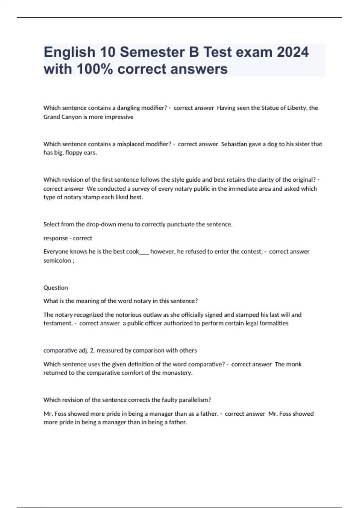 Which sentence contains a dangling modifier? - correct answer Having seen the Statue of Liberty, the Grand Canyon is more impressive Which sentence contains a misplaced modifier? - correct answer Sebastian gave a dog to his sister that has big, floppy ears. Which revision of the first sentence follows the style guide and best retains the clarity of the original? - correct answer We conducted a survey of every notary public in the immediate area and asked which type of notary stamp each liked best. Select from the drop-down menu to correctly punctuate the sentence. response - correct Everyone knows he is the best cook___ however, he refused to enter the contest. - correct answer semicolon ; Question What is the meaning of the word notary in this sentence? The notary recognized the notorious outlaw as she officially signed and stamped his last will and testament. - correct answer a public officer authorized to perform certain legal formalities comparative adj. 2. measured by comparison with others Which sentence uses the given definition of the word comparative? - correct answer The monk returned to the comparative comfort of the monastery. Which revision of the sentence corrects the faulty parallelism? Mr. Foss showed more pride in being a manager than as a father. - correct answer Mr. Foss showed more pri