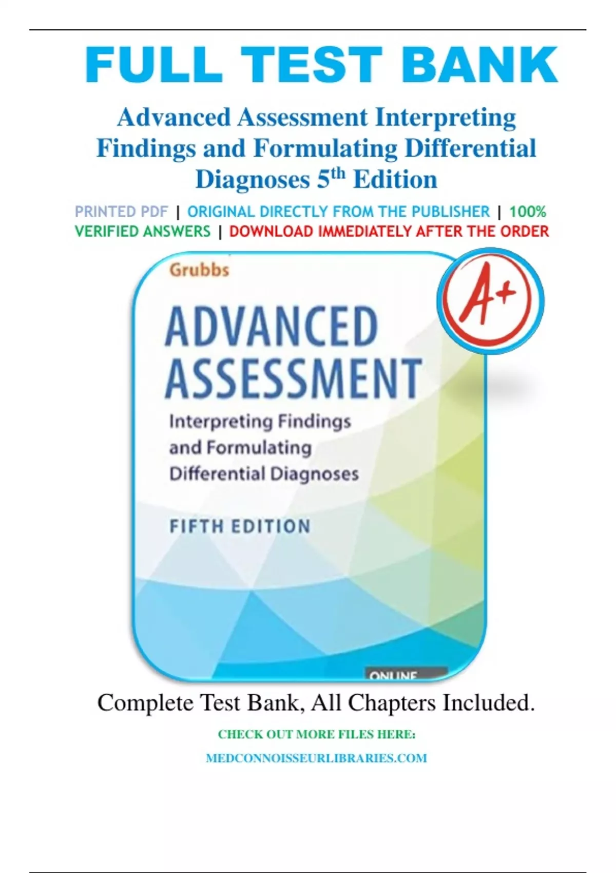 TEST BANK FOR ADVANCED ASSESSMENT: INTERPRETING FINDINGS AND FORMULATING DIFFERENTIAL DIAGNOSES 5th Edition, Mary Jo Goolsby, Laurie Grubbs