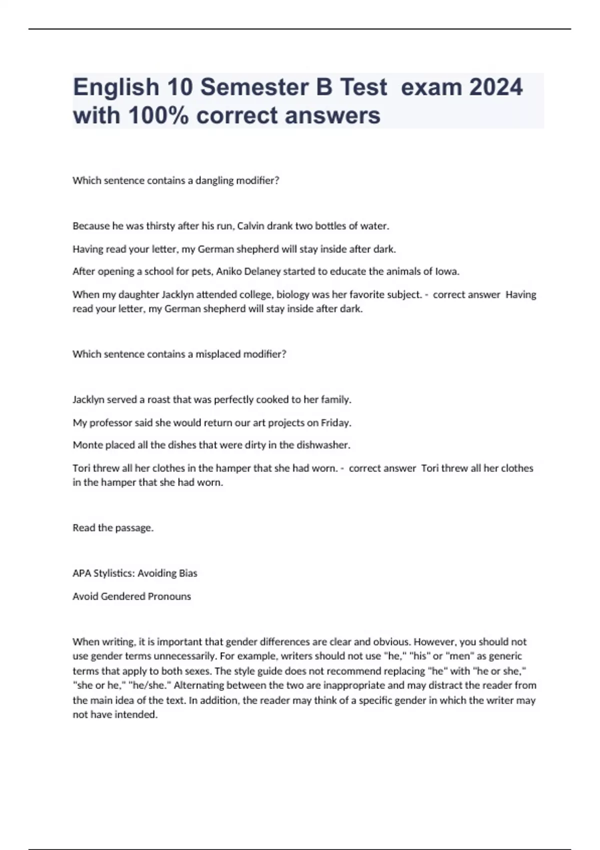 Which sentence contains a dangling modifier? Because he was thirsty after his run, Calvin drank two bottles of water. Having read your letter, my German shepherd will stay inside after dark. After opening a school for pets, Aniko Delaney started to educate the animals of Iowa. When my daughter Jacklyn attended college, biology was her favorite subject. - correct answer Having read your letter, my German shepherd will stay inside after dark. Which sentence contains a misplaced modifier? Jacklyn served a roast that was perfectly cooked to her family. My professor said she would return our art projects on Friday. Monte placed all the dishes that were dirty in the dishwasher. Tori threw all her clothes in the hamper that she had worn. - correct answer Tori threw all her clothes in the hamper that she had worn. Read the passage. APA Stylistics: Avoiding Bias Avoid Gendered Pronouns When writing, it is important that gender differences are clear and obvious. However, you should not use gender terms unnecessarily. For example, writers should not use "he," "his" or "men" as generic terms that apply to both sexes. The style guide does not recommend replacing "he" with "he or she," "she or he," "he/she." Alternating between the two are inappropriate and may distract the reader from the main idea of the text. In addition, the reader may think of a specific gender in which the writer may not have intended. To avoid bias of using gendered pronouns: Use plural nouns or plural pronouns—for the opportunity to use "they" or "their" Use an article rather than a pronoun—instead of "his" use "the" Eliminate the pronoun—Omitting "his" is fine for many sentences. Replace the pronoun with a noun such as "child" "person", "physician, - correct answer We conducted a survey of every notary public in the immediate area and asked which type of notary stamp each liked best. Select from the drop-down menu to correctly punctuate the sentence. Everyone knows he is the best cook (, ; :) however, he refused to enter the contest. - correct answer ; What is the me