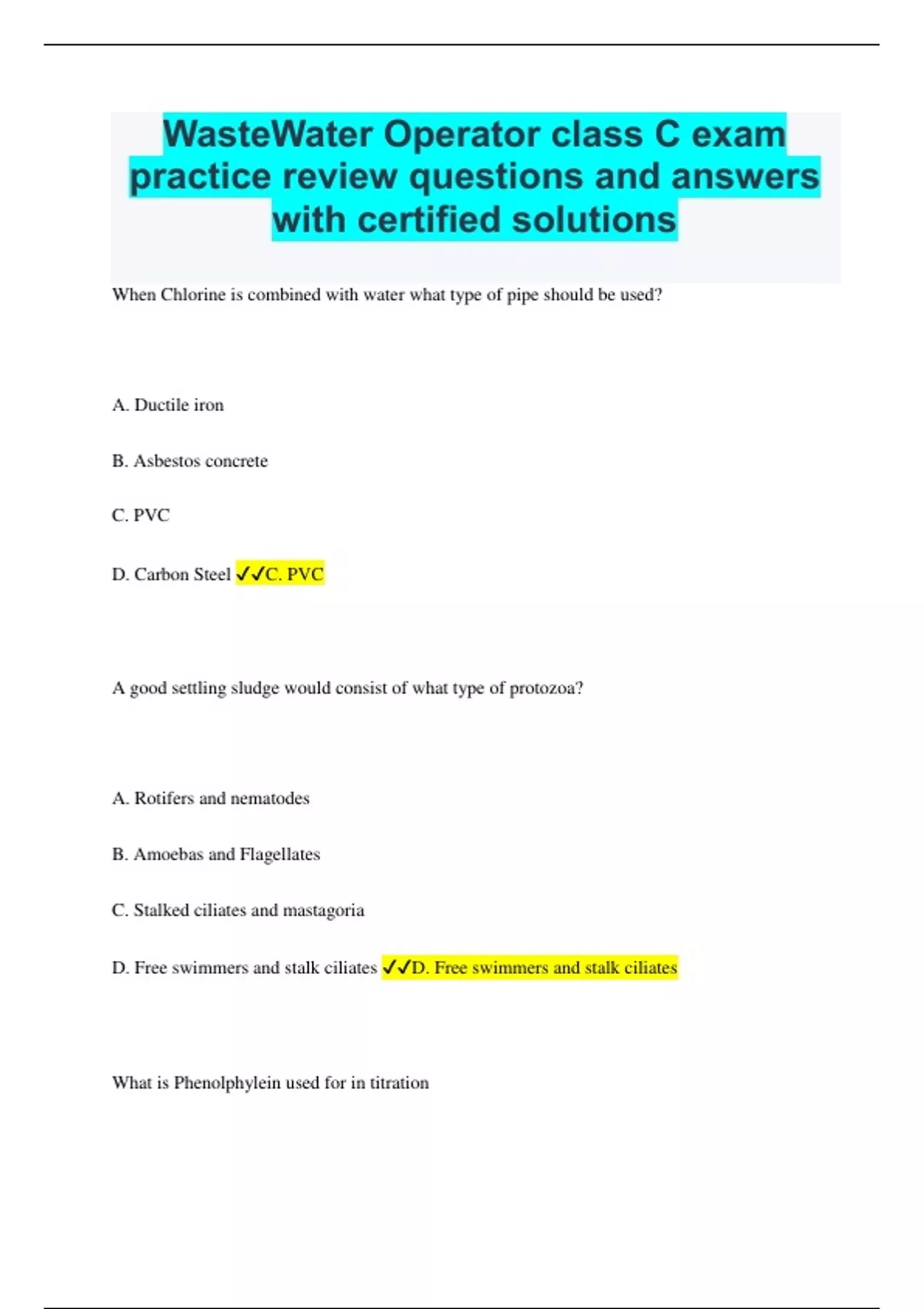 WasteWater Operator class C exam practice review questions and answers with certified solutions