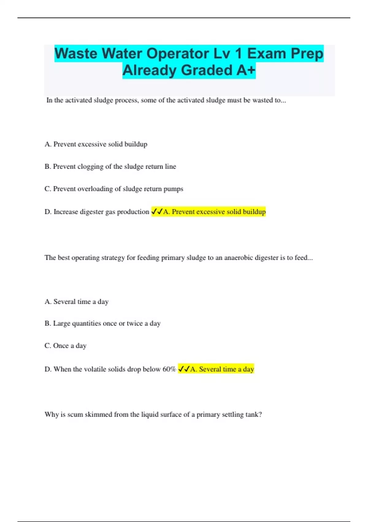 In the activated sludge process, some of the activated sludge must be wasted to... A. Prevent excessive solid buildup B. Prevent clogging of the sludge return line C. Prevent overloading of sludge return pumps D. Increase digester gas production A. Prevent excessive solid buildup The best operating strategy for feeding primary sludge to an anaerobic digester is to feed... A. Several time a day B. Large quantities once or twice a day C. Once a day D. When the volatile solids drop below 60% A. Several time a day
