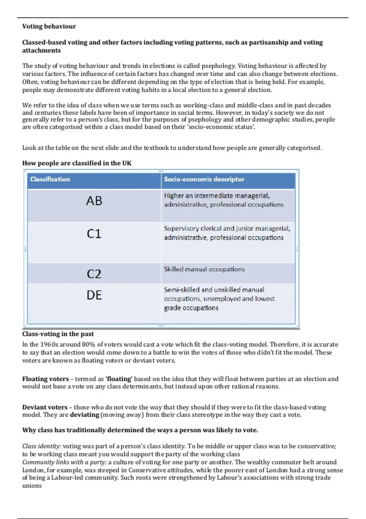 Summary A-Level Edexcel Politics Paper 1 UK Voting Behaviour revision notes