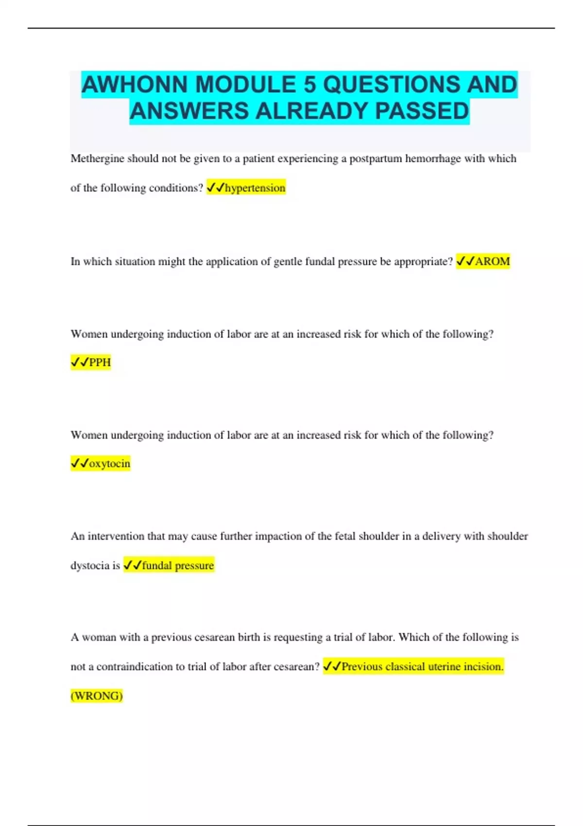 AWHONN MODULE 5 QUESTIONS AND ANSWERS ALREADY PASSED