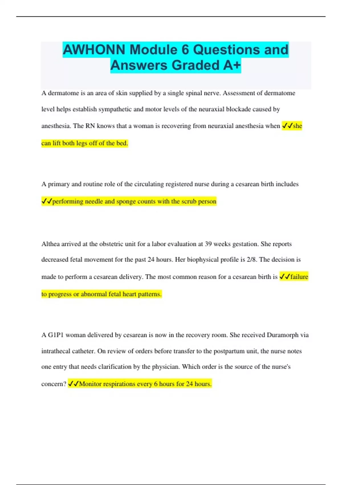 AWHONN Module 6 Questions and Answers Graded A+ A dermatome is an area of skin supplied by a single spinal nerve. Assessment of dermatome level helps establish sympathetic and motor levels of the neuraxial blockade caused by anesthesia. The RN knows that a woman is recovering from neuraxial anesthesia when she can lift both legs off of the bed. A primary and routine role of the circulating registered nurse during a cesarean birth includes performing needle and sponge counts with the scrub person Althea arrived at the obstetric unit for a labor evaluation at 39 weeks gestation. She reports decreased fetal movement for the past 24 hours. Her biophysical profile is 2/8. The decision is made to perform a cesarean delivery. The most common reason for a cesarean birth is failure to progress or abnormal fetal heart patterns. A G1P1 woman delivered by cesarean is now in the recovery room. She received Duramorph via intrathecal catheter. On review of orders before transfer to the postpartum unit, the nurse notes one entry that needs clarification by the physician. Which order is the source of the nurse's concern? Monitor respirations every 6 hours for 24 hours. Which of the following best describes the respiratory status assessment performed in the PACU? Inspection, auscultation, and oxygen saturation Which of the following is recommended thromboprophylaxis for all women having a cesarean birth? Placement of pneumatic compression devices A woman is to receive general anesthesia for an unscheduled cesarean birth. The anesthesiologist asks if she or anyone in her immediate family has had problems with general anesthesia in the past. This question is asked to screen for which of the following? Malignant hyperthermia Which of the following is a contraindication to the administration of regional analgesia and anesthesia? Local infection at the site of injection A rapid assessment of maternal status is completed immediately on arrival prior to the anesthesiologist provider leaving the PACU. If the mother is stable, the RN accepts the transfer and assumes care of the mother. In situations in which the mother is not stable the nurse should expect that Cardiac output in the immediate postpartum period is increased * A woman who is G2P2 has had a primary cesarean at 34 weeks gestation due to preeclampsia with severe features. Due to difficulty with respiratory transitioning, the newborn has been transferred to the nursery and the mother is admitted to the labor and delivery PACU. Her vital signs are as follows: 94 BPM heart rate / 144/98 mmHg blood pressure / 18 per minute respirations / 98% PaO2 on pulse oximeter / 97.6F temperature. Magnesium sulfate is infusing at 2 grams per hour, urine output is 60 ml in the past hour, and reflexes are 2+. She received neuraxial anesthesia for the cesarean. Which of the following is your primary concern? Fundal location and bleeding amount Measures to prevent hypothermia may include all of the following except maintaining room temperature at 72 degrees Fahrenheight Best practice includes which of the following The level of care provided when a patient is emerging from a surgical procedure requiring anesthesia or sedation is referred to as phase 1. Postoperative assessment guidelines recommend that vital signs, including blood pressure, pulse, and respirations, be recorded every