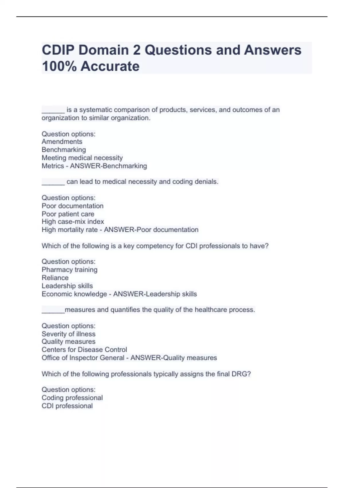 CDIP Domain 2 Questions and Answers 100% Accurate CDIP Domain 2 Questions and Answers 100% Accurate CDIP Domain 2 Questions and Answers 100% Accurate ______ is a systematic comparison of products, services, and outcomes of an organization to similar organization. Question options: Amendments Benchmarking Meeting medical necessity Metrics - ANSWER-Benchmarking ______ can lead to medical necessity and coding denials. Question options: Poor documentation Poor patient care High case-mix index High mortality rate - ANSWER-Poor documentation Which of the following is a key competency for CDI professionals to have? Question options: