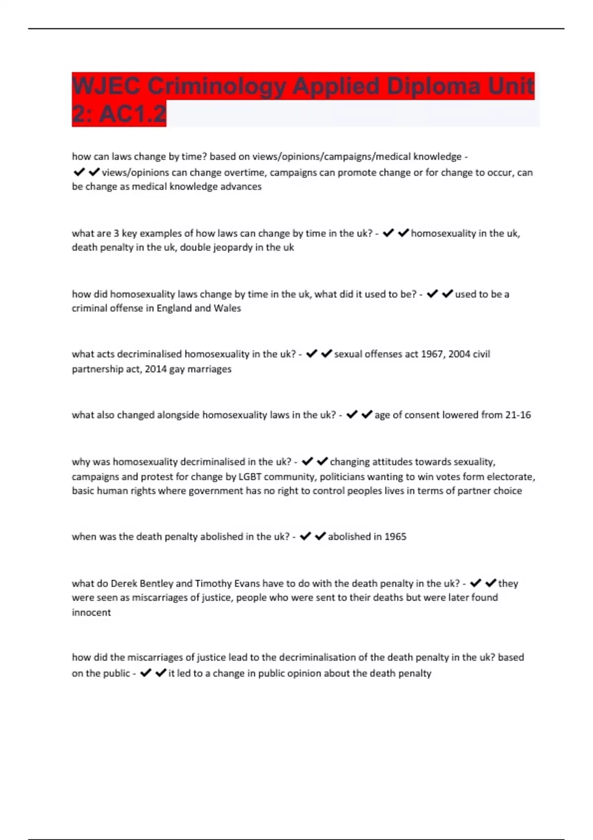 how can laws change by time? based on views/opinions/campaigns/medical knowledge - views/opinions can change overtime, campaigns can promote change or for change to occur, can be change as medical knowledge advances what are 3 key examples of how laws can change by time in the uk? - homosexuality in the uk, death penalty in the uk, double jeopardy in the uk how did homosexuality laws change by time in the uk, what did it used to be? - used to be a criminal offense in England and Wales what acts decriminalised homosexuality in the uk? - sexual offenses act 1967, 2004 civil partnership act, 2014 gay marriages what also changed alongside homosexuality laws in the uk? - age of consent lowered from 21-16 why was homosexuality decriminalised in the uk? - changing attitudes towards sexuality, campaigns and protest for change by LGBT community, politicians wanting to win votes form electorate, basic human rights where government has no right to control peoples lives in terms of partner choice when was the death penalty abolished in the uk? - abolished in 1965 what do Derek Bentley and Timothy Evans have to do with the death penalty in the uk? - they were seen as miscarriages of justice, people who were sent to their deaths but were later found innocent how did the miscarriages of justice lead to the decriminalisation of the death penalty in the uk? based on the public - it led to a change in public opinion about the death penaltywhat was another reason the death penalty was abolished in the uk related to DNA? - DNA evidence developed, more reliable and accurate why was the double jeopardy law abolished in the uk? - following a series of high profile campaigns e.g. Ann Ming Criminal Justice Act 2003 what might be a reason for wanting to abolish the double jeopardy law in the uk? - finding new compelling evidence e.g. DNA evidence how can laws change by place? based on criminal offenses in different countries - the same criminal offenses are not necessarily in place throughout the whole world or even policed the same way as in England and Wales what are 3 key examples of how laws change by place? - jaywalking in the USA, Marijuana, Death Penalty in the USA and UK where is jaywalking illegal? - in most urban areas, in the USA, canada, singapore, poland why might jaywalking be illegal in the USA? - for individuals safety, there are complex roads, larger and more lanes, more accidents likely to occur