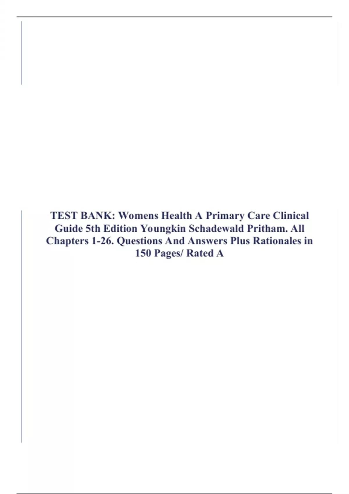 [COMPANY NAME] [Company address]TEST BANK: Womens Health A Primary Care Clinical Guide 5th Edition Youngkin Schadewald Pritham. All Chapters 1-26. Questions And Answers Plus Rationales in 150 Pages/ Rated A WWW.NURSINGTESTBANKSWORLD.CO