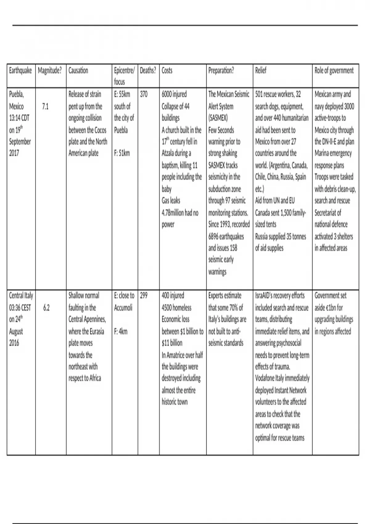 Earthquake Magnitude? Causation Epicentre/ Deaths? Costs Preparation? Relief Role of government