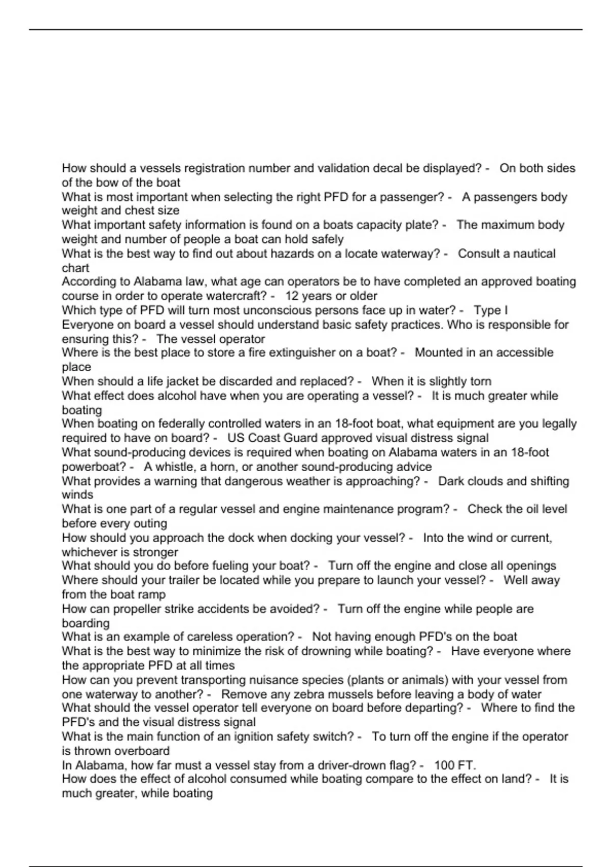 How should a vessels registration number and validation decal be displayed? - On both sides of the bow of the boat What is most important when selecting the right PFD for a passenger? - A passengers body weight and chest size What important safety information is found on a boats capacity plate? - The maximum body weight and number of people a boat can hold safely What is the best way to find out about hazards on a locate waterway? - Consult a nautical chart According to Alabama law, what age can operators be to have completed an approved boating course in order to operate watercraft? - 12 years or older Which type of PFD will turn most unconscious persons face up in water? - Type I Everyone on board a vessel should understand basic safety practices. Who is responsible for ensuring this? - The vessel operator Where is the best place to store a fire extinguisher on a boat? - Mounted in an accessible place When should a life jacket be discarded and replaced? - When it is slightly torn What effect does alcohol have when you are operating a vessel? - It is much greater while boating When boating on federally controlled waters in an 18-foot boat, what equipment are you legally required to have on board? - US Coast Guard approved visual distress signal What sound-producing devices is required when boating on Alabama waters in an 18-foot powerboat? - A whistle, a horn, or another sound-producing advice What provides a warning that dangerous weather is approaching? - Dark clouds and shifting winds What is one part of a regular vessel and engine maintenance program? - Check the oil level before every outing How should you approach the dock when docking your vessel? - Into the wind or current, whichever is stronger