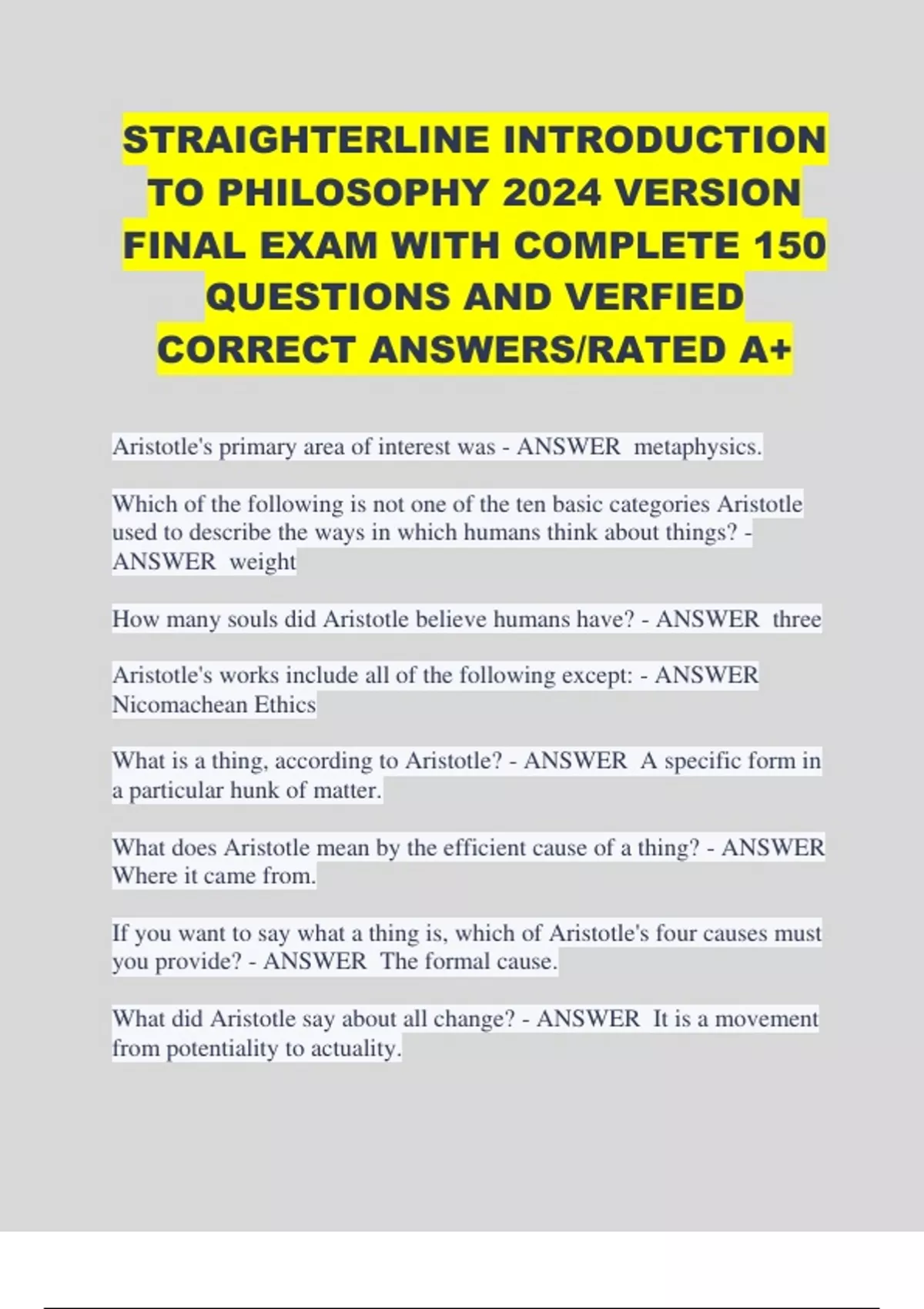 STRAIGHTERLINE INTRODUCTION TO PHILOSOPHY 2024 VERSION FINAL EXAM WITH COMPLETE 150 QUESTIONS AND VERFIED CORRECT ANSWERS/RATED A+