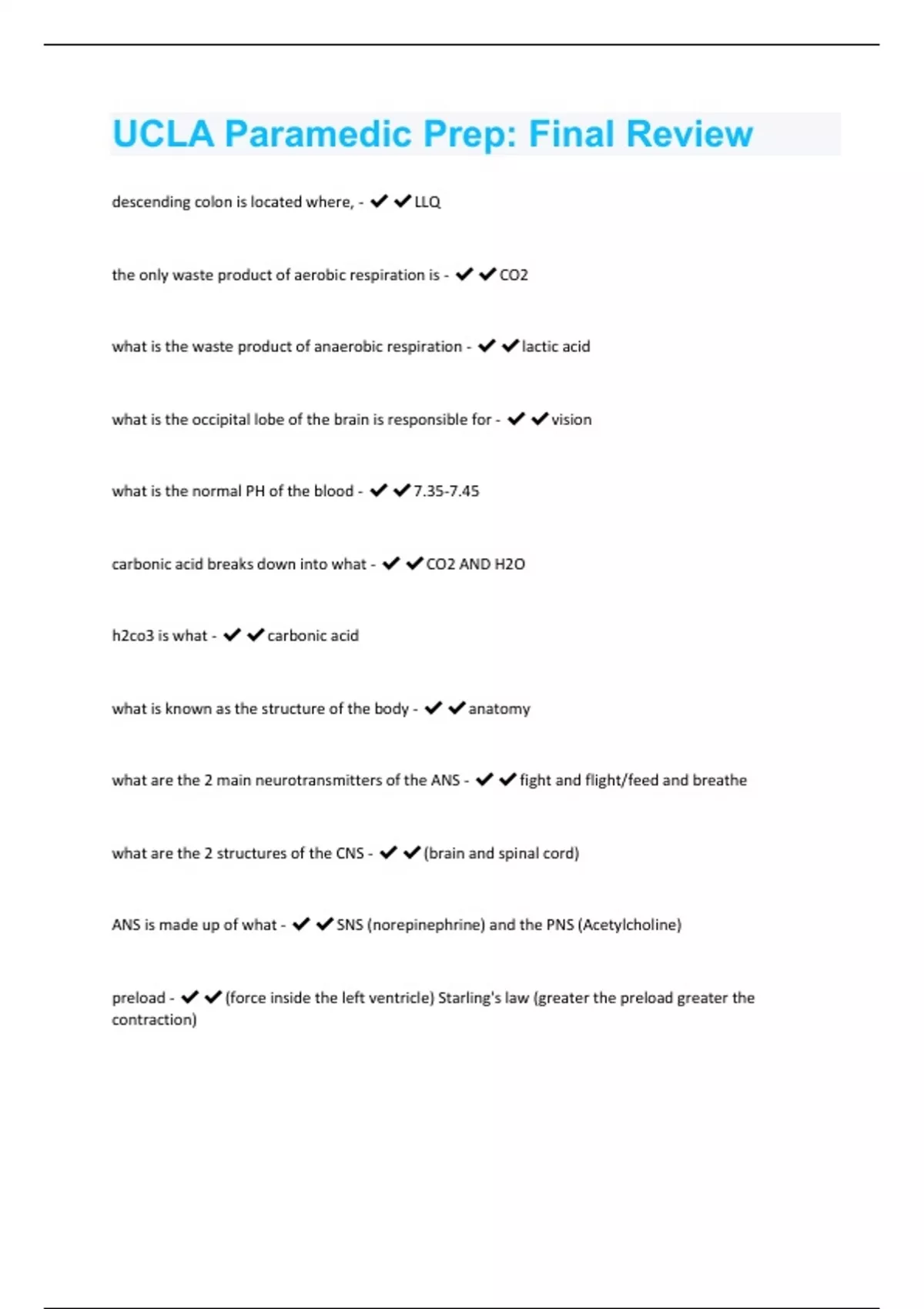 descending colon is located where, - LLQ the only waste product of aerobic respiration is - CO2 what is the waste product of anaerobic respiration - lactic acid what is the occipital lobe of the brain is responsible for - vision what is the normal PH of the blood - 7.35-7.45 carbonic acid breaks down into what - CO2 AND H2O h2co3 is what - carbonic acid what is known as the structure of the body - anatomy what are the 2 main neurotransmitters of the ANS - fight and flight/feed and breathe what are the 2 structures of the CNS - (brain and spinal cord) ANS is made up of what - SNS (norepinephrine) and the PNS (Acetylcholine) preload - (force inside the left ventricle) Starling's law (greater the preload greater the contraction)name 4 physiological changes during a sympathetic response - (pupil dilation, bronchiole dilation, increased HT and vasoconstriction), GI activity slows down, liver stores glycogen which will convert to glucose for instant fuel Vfib- - no organized electrical activity and is shockable, 0 pulse V-tach - tall tell sign is it has the same amplitude Afib- - tall tell signs are less than .12 and 0 PRI vagus nerve is the - 10/12 cranial nerve part of the PNS drops BP and HT minute volume = - MV how much air make it to the alveoli per minute MV= tidal volume X respiratory rate - dead space vital capacity of your lungs is about how many liters - 6L tidal volume is the - amount air in one breath (500ml) dead space is - the amount of air that doesn't make it to the alveoli a group of cells that perform a similar function is - are tissue cells ex: (GI tissue) when the kidney secretes renin and mixes with angiotensinogen secreted by the liver producing what . - angiotensin 1 P waves need to be 3 things - upright, uniform, and round with 1:1 ratio each small box on an ECG is how big - .04QRS is narrow if it is - less than .12