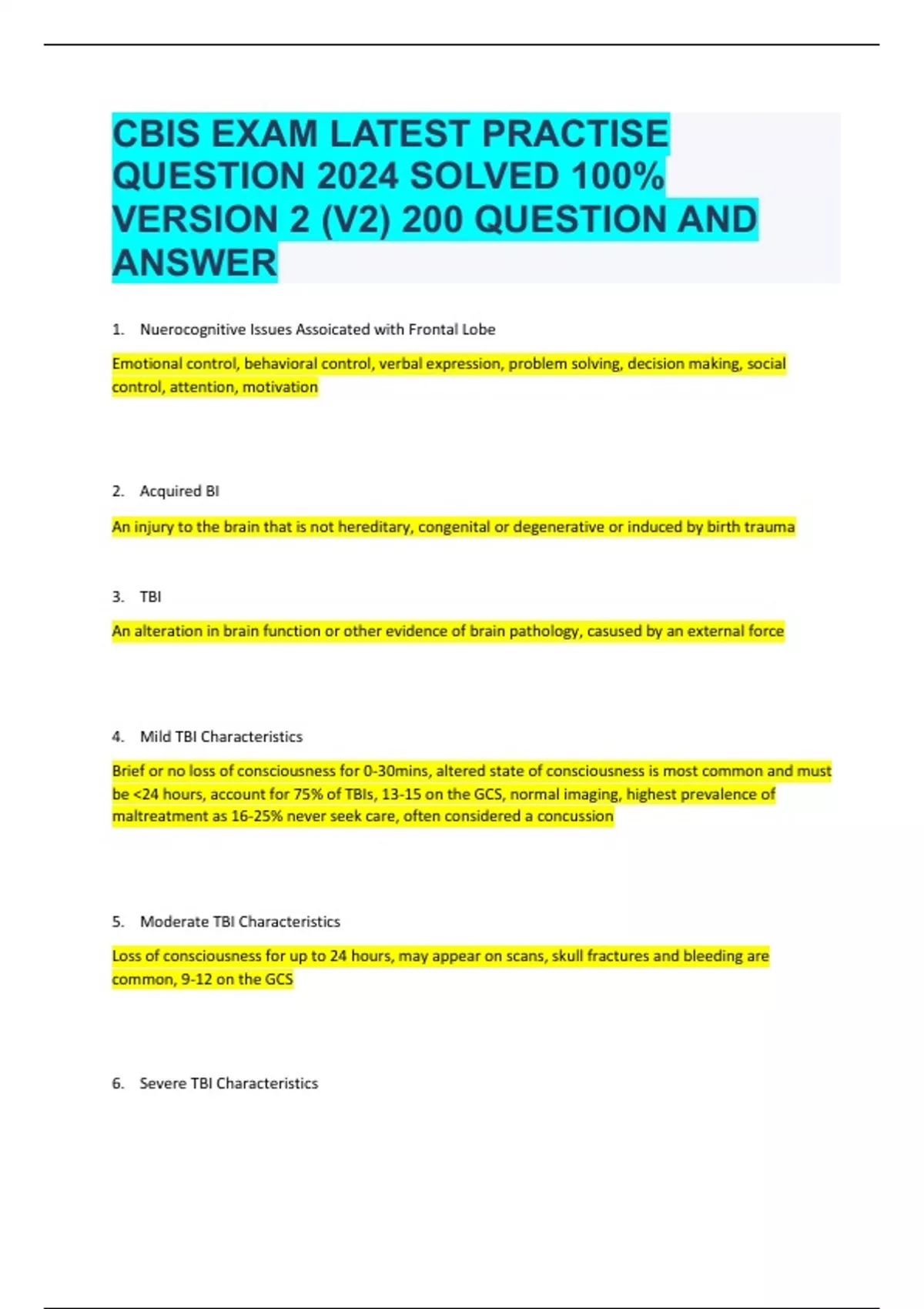 CBIS EXAM LATEST PRACTISE QUESTION 2024 SOLVED 100% VERSION 2 (V2) 200 QUESTION AND ANSWER 1. Nuerocognitive Issues Assoicated with Frontal Lobe Emotional control, behavioral control, verbal expression, problem solving, decision making, social control, attention, motivation 2. Acquired BI An injury to the brain that is not hereditary, congenital or degenerative or induced by birth trauma 3. TBI An alteration in brain function or other evidence of brain pathology, casused by an external force