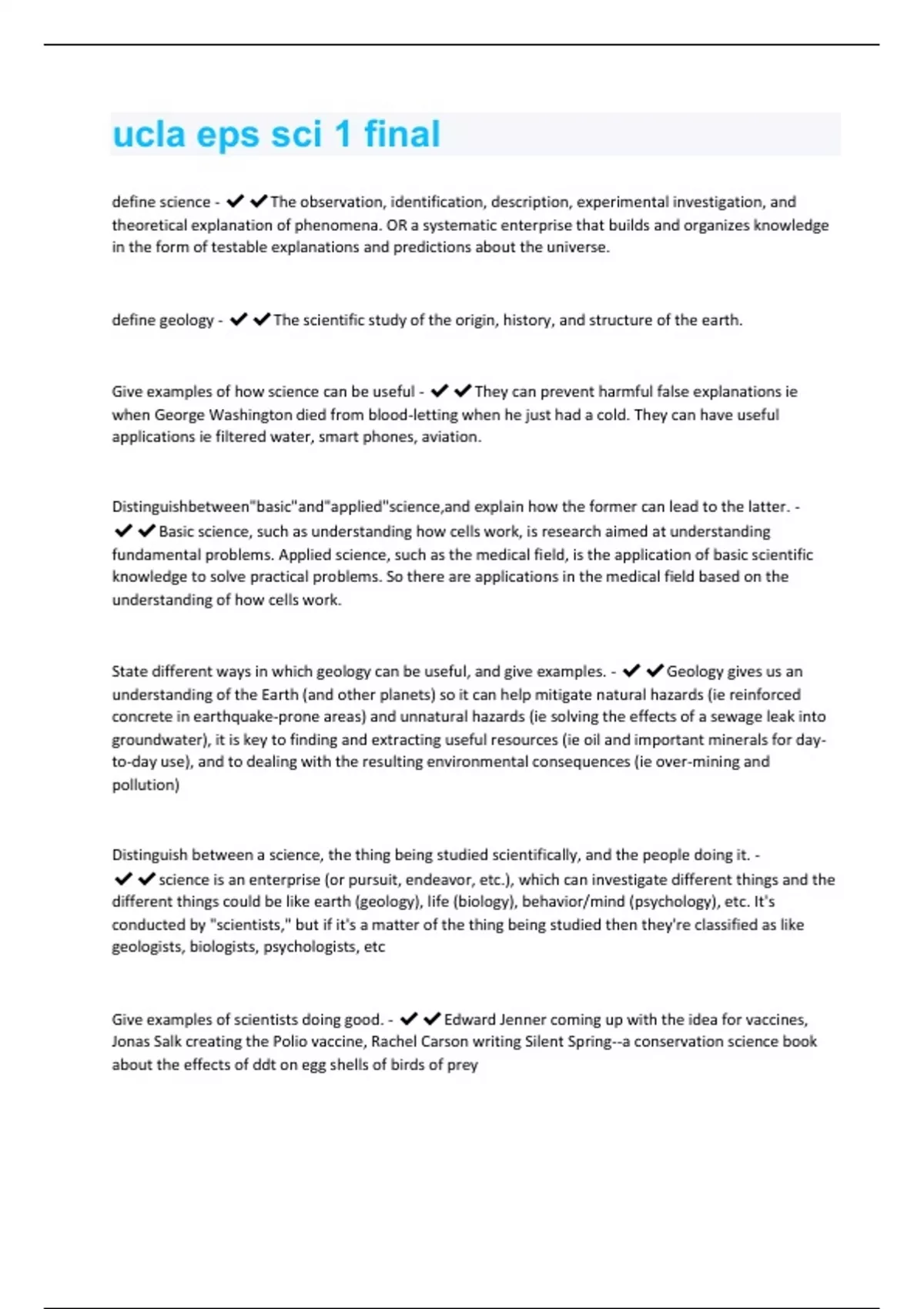 define science - The observation, identification, description, experimental investigation, and theoretical explanation of phenomena. OR a systematic enterprise that builds and organizes knowledge in the form of testable explanations and predictions about the universe. define geology - The scientific study of the origin, history, and structure of the earth. Give examples of how science can be useful - They can prevent harmful false explanations ie when George Washington died from blood-letting when he just had a cold. They can have useful applications ie filtered water, smart phones, aviation. Distinguishbetween"basic"and"applied"science,and explain how the former can lead to the latter. - Basic science, such as understanding how cells work, is research aimed at understanding fundamental problems. Applied science, such as the medical field, is the application of basic scientific knowledge to solve practical problems. So there are applications in the medical field based on the understanding of how cells work. State different ways in which geology can be useful, and give examples. - Geology gives us an understanding of the Earth (and other planets) so it can help mitigate natural hazards (ie reinforced concrete in earthquake-prone areas) and unnatural hazards (ie solving the effects of a sewage leak into groundwater), it is key to finding and extracting useful resources (ie oil and important minerals for dayto-day use), and to dealing with the resulting environmental consequences (ie over-mining and pollution) Distinguish between a science, the thing being studied scientifically, and the people doing it. - science is an enterprise (or pursuit, endeavor, etc.), which can investigate different things and the different things could be like earth (geology), life (biology), behavior/mind (psychology), etc. It's conducted by "scientists," but if it's a matter of the thing being studied then they're classified as like geologists, biologists, psychologists, etc Give examples of scientists doing good. - Edward Jenner coming up with the idea for vaccines, Jonas Salk creating the Polio vaccine, Rachel Carson writing Silent Spring--a conservation science book about the effects of ddt on egg shells of birds of preyDiscuss how science considered morally bad can beprevented. - Can be prevented through government regulation ie the FDA and by funding "good" science programs ie NASA and NSF. Also, scientists can join associations like the World Medical Association (WMA) which declares ethical principles regrading human experimentation. Describe how human flaws can negatively impact the quality of the science that they do. - Scientists can be biased or dishonest with their findings which can affect the data and make their findings untrustworthy. List the steps/components of the scientific method. - It's a cycle of making observations, then thinking of questions, then forming a hypothesis and developing testable predictions. From there, you can gather data to test predictions which will either lead to developing general theories or altering the initial hypothesis leading back to developing testable predictions. Once you're at the stage of developing general theories, though, you can make more observations and the cycle continues. Describe how adherence to the scientific method ensures evidence-based explanations for phenomena. - It ensures evidence-based explanations because part of the scientific method is literally gathering data to test the predictions and from that developing general theories. Discuss factors in good experimental design. - A control group (used to challenge previous scientific method; does not receive treatment), sufficient sample size (to get more reliable results), a representative sample(must represent the population of what's being studied), and it should be a reproducible experiment(so that it can be redone and more data can be gathered).