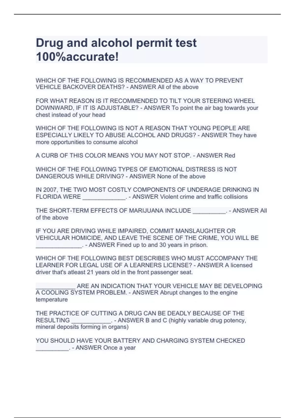 Drug and alcohol permit WHICH OF THE FOLLOWING IS RECOMMENDED AS A WAY TO PREVENT VEHICLE BACKOVER DEATHS? - ANSWER All of the above FOR WHAT REASON IS IT RECOMMENDED TO TILT YOUR STEERING WHEEL DOWNWARD, IF IT IS ADJUSTABLE? - ANSWER To point the air bag towards your chest instead of your head WHICH OF THE FOLLOWING IS NOT A REASON THAT YOUNG PEOPLE ARE ESPECIALLY LIKELY TO ABUSE ALCOHOL AND DRUGS? - ANSWER They have more opportunities to consume alcohol A CURB OF THIS COLOR MEANS YOU MAY NOT STOP. - ANSWER Red WHICH OF THE FOLLOWING TYPES OF EMOTIONAL DISTRESS IS NOT DANGEROUS WHILE DRIVING? - ANSWER None of the above IN 2007, THE TWO MOST COSTLY COMPONENTS OF UNDERAGE DRINKING IN FLORIDA WERE _____________. - ANSWER Violent crime and traffic collisions THE SHORT-TERM EFFECTS OF MARIJUANA INCLUDE __________. - ANSWER All of the above test 100%accurate!